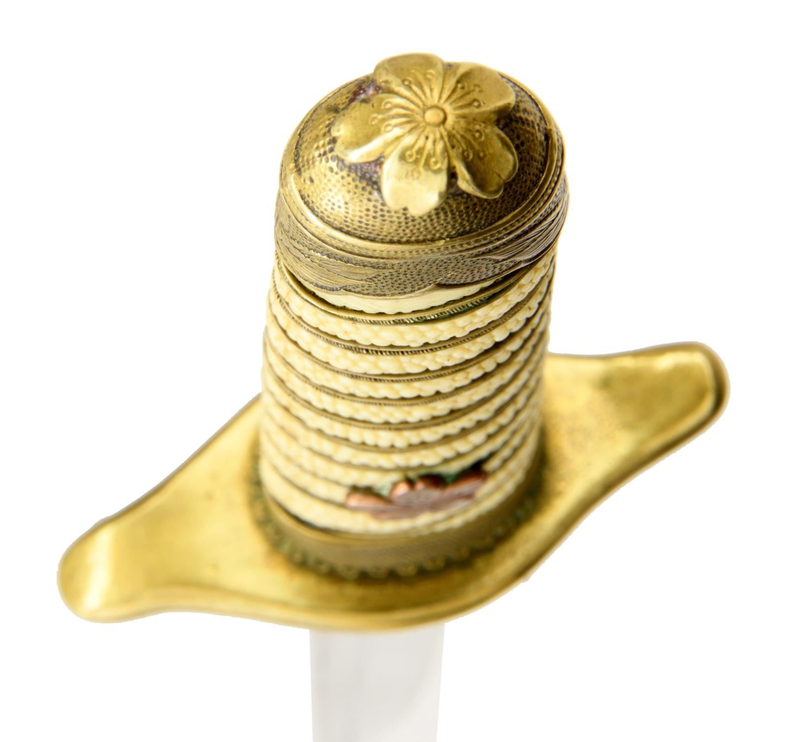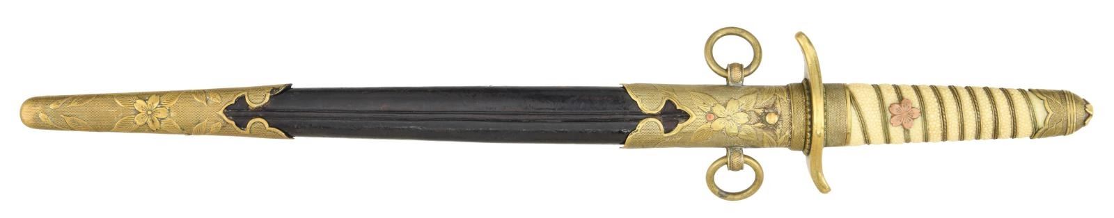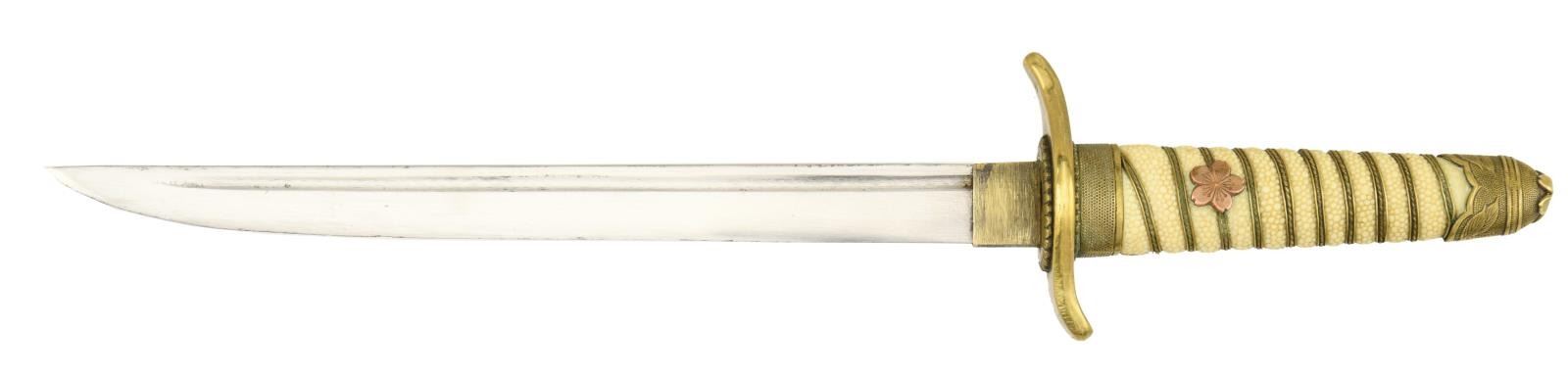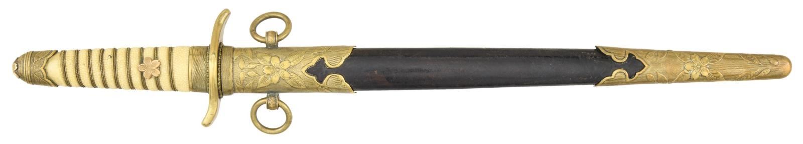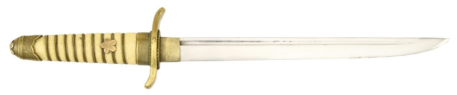 Overall length: 16 3/8". Blade length: 8 1/2".This M1883 (Meiji 16) Naval dagger has a blade with a narrow full length hi and a brass habaki. S-shaped tsuba with a single seppa above & below. Brass fuchi & kashira with a cherry blossom on the top. Simulated same tsuka with wire wrap and a 5 petal cherry blossom on each side. Saya is leather covered wood with gilded brass mounts featuring a cherry blossom & leaf design. CONDITION: blade has a fine polish. Tsuka shows light wear, as does the saya. PROVENANCE: From the Lifelong Collection of Glen E. Mattox. (02-18419/BF). $600-800.
