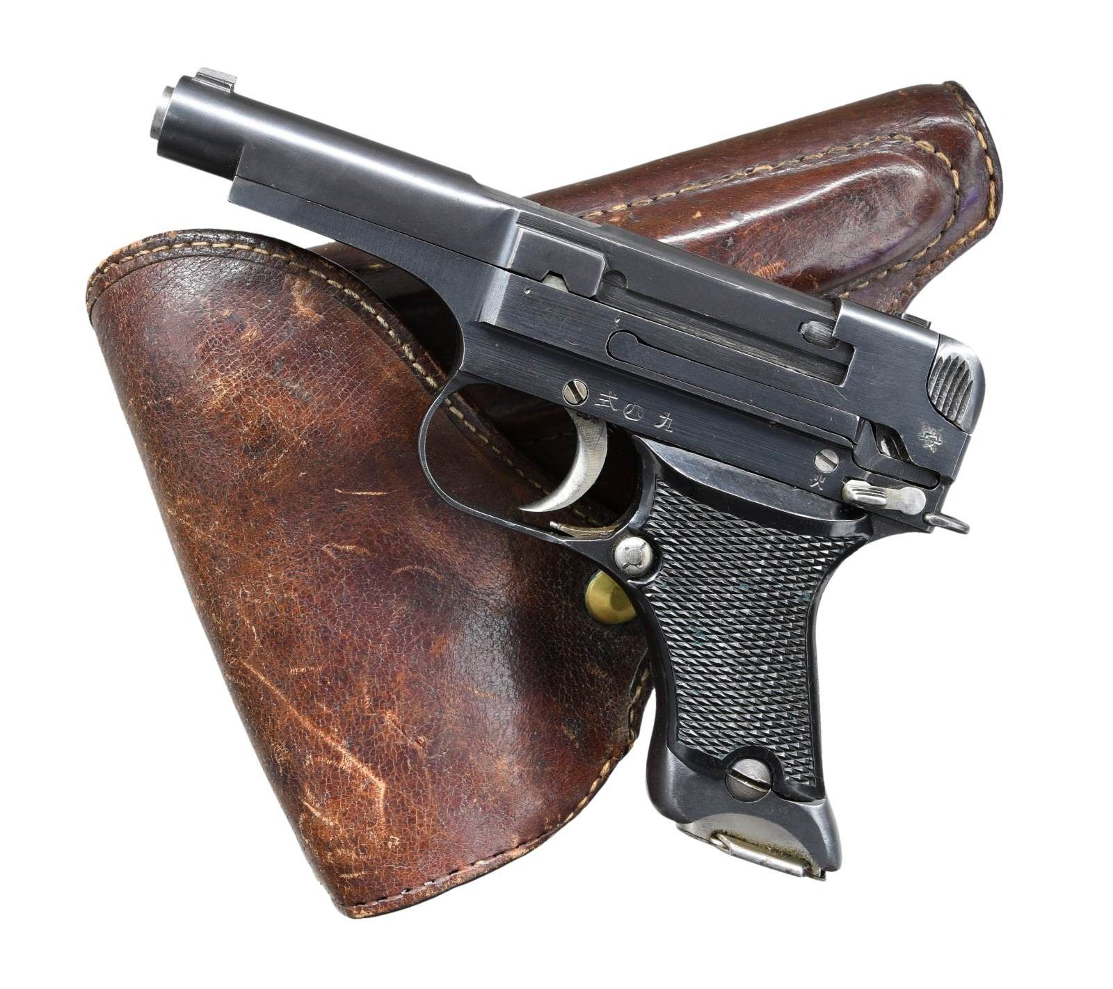 SEMI-AUTO PISTOL. Cal. 8mm Nambu. S# 12895. S# matches on frame & trigger. Bbl. 3 7/8" w/ fixed sights. "S/A". Frame is marked on right side w/ "Nagoya Arsenal" marking preceded by "Nambu" mark indicating factory of mfg. Also marked "15.7" indicating mfg. "July 1940". Left side of frame marked over trigger "Type 94". Coarse checkered Bakelite grips. Lanyard loop at rear of frame. MAGS: 2 nickel plated 6 rd. mags. 1 is matching. UNATTACHED ACCESSORIES: correct brown leather holster w/ no visible markings except name of "Sgt. Keith Hackett". Holster has extensive wear & handling marks w/ areas of loose stitching. CONDITION: pistol retains 90% original blue finish which is of the high quality noted in earlier production guns. Grips have light wear & handling marks plus missing diamonds. Bore is shiny w/ worn lands. PROVENANCE: From the Lifelong Collection of Glen E. Mattox. (23-73/RW). CURIO. $500-700.