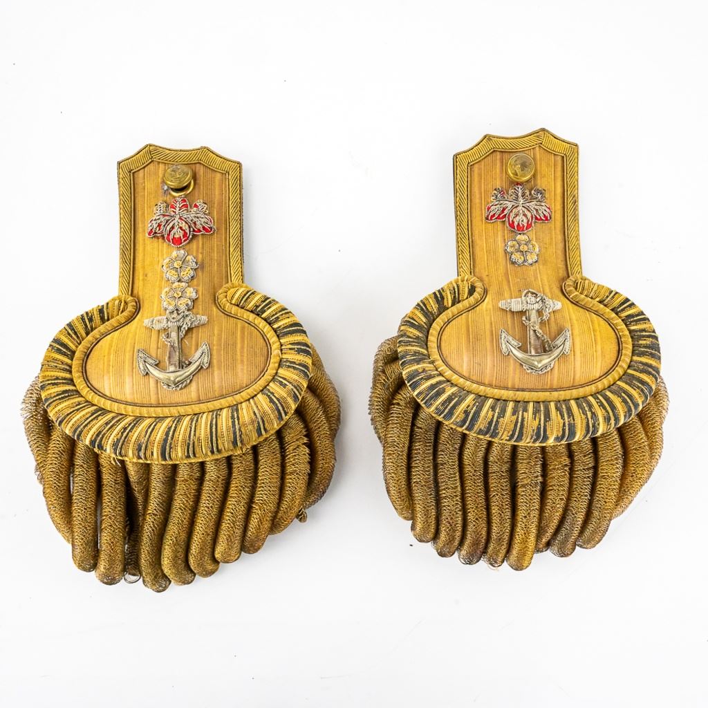 This named set of IJN Captain shoulder boards and "Fore and Aft" hat comes in full storage case. The hat is a smaller size and has three character for owner's name. Condition is good with some loose gold bullion coils on left side end. Wear to black body on ends showing much wear and use. The very thin chinstrap rope tie is broken on one end. The shoulder boards are in very good condition with 2 kanji characters marked on back steel clips. Board bullion wire should much dark tarnish in spots. Boards are held in place with white string ties. Hat has red tin inset to protect it and also has the velvet top insert to protect the boards. The case has much wear and age all over with dryness to all leather fittings and corners inside and out. Top on inside lid has very nice company label for Suzuki Co. Tokyo with lion logo. This is a complete and handsome set with research possibilities.