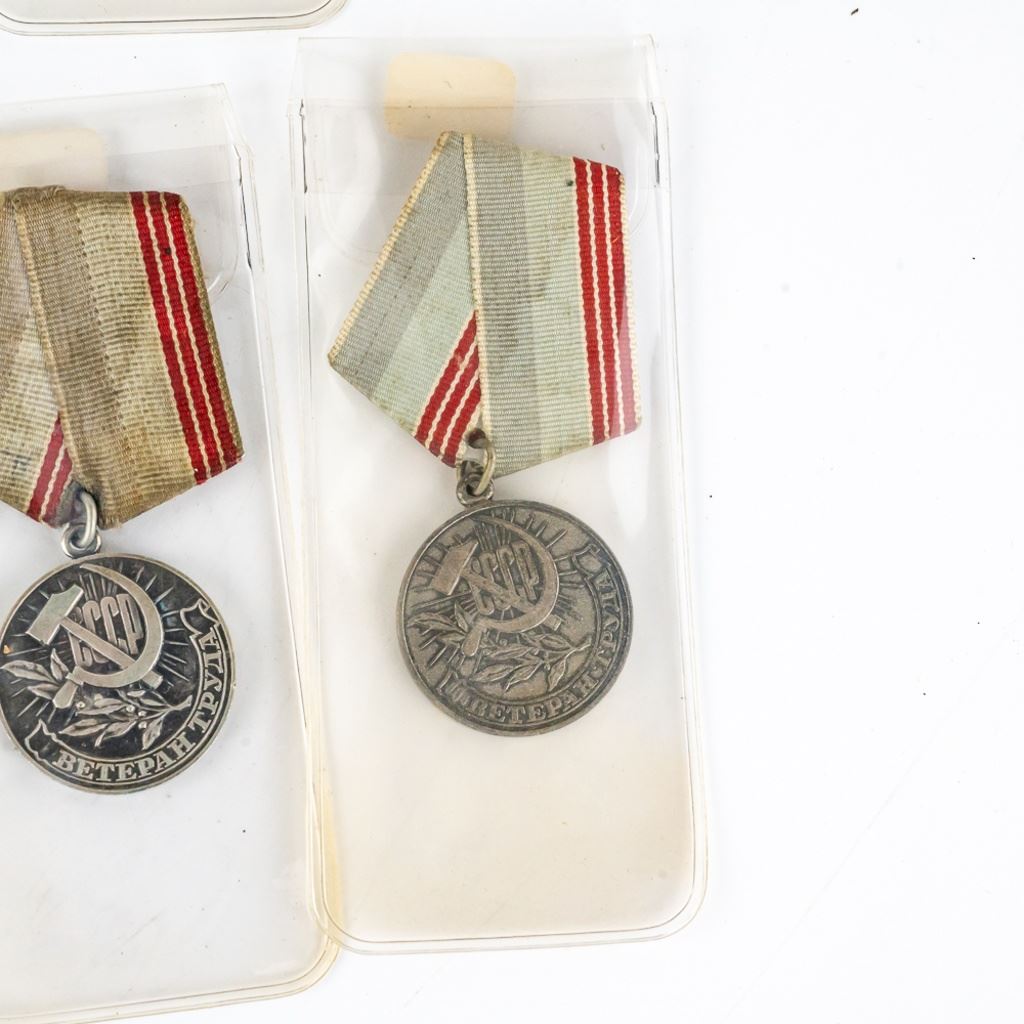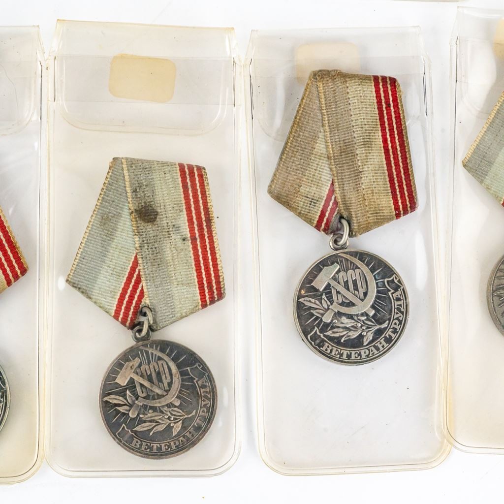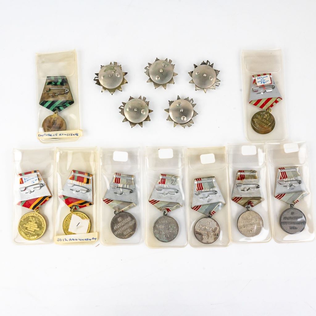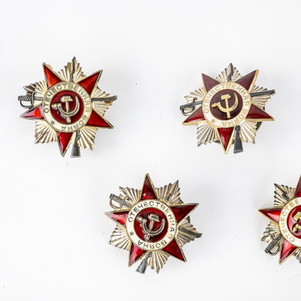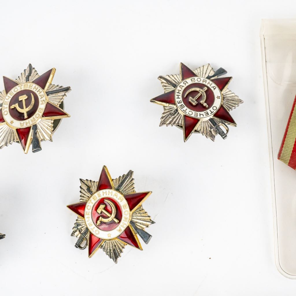 Includes 9 medals and 5 Patriotic War 2nd Class badges numbered 5967031, 1692155, 2974941, 3132887, 1201532. A great lot for collector or dealer.
