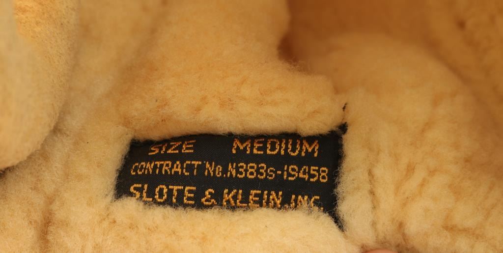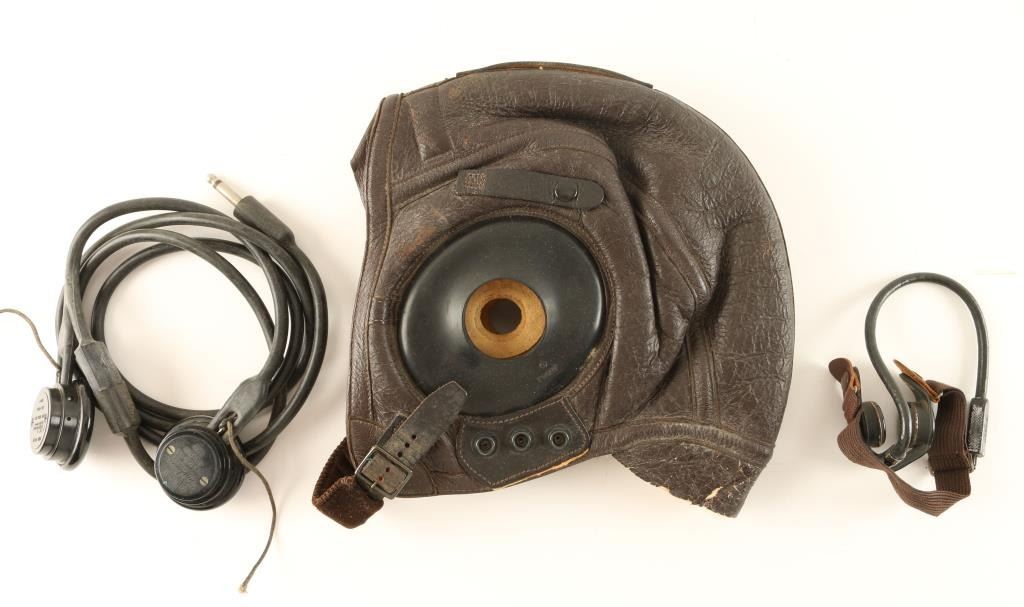 Vintage A-11 style U.S. flight helmet with headphones and microphone. Manufactured by Slote & Klein Inc., size medium. In good to very good overall condition.
