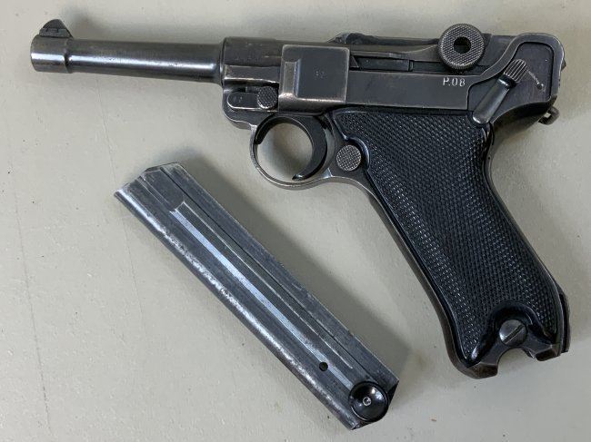 WWII NAZI GERMAN P08 LUGER byf 42 "BLACK WIDOW" PISTOL 9MM .VERY GOOD CONDITION GUN WITH ALL NUMBERS MATCHING AND CORRECT BLACK BAKELITE BOTTOM MAGAZINE ! GREAT BORE . SER. # 4869. BLACK BAKELITE CHECKERED GRIPS . ORIGINAL FINISH IS ABOUT 90%. GREAT AND HIGHLY DESIRABLE GUN. FFL REQUIRED . NO INTERNATIONAL BIDDERS PLEASE