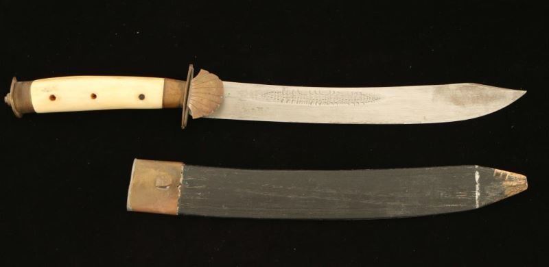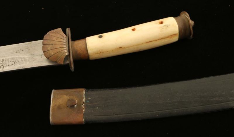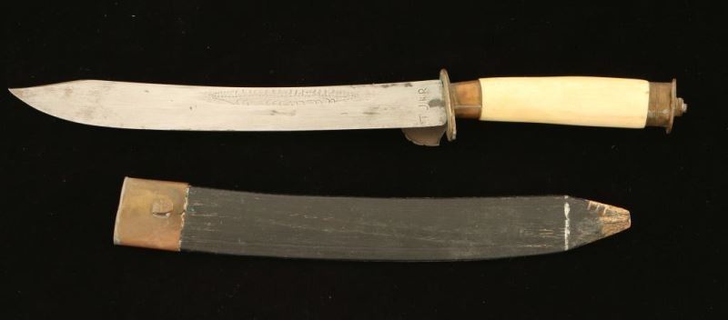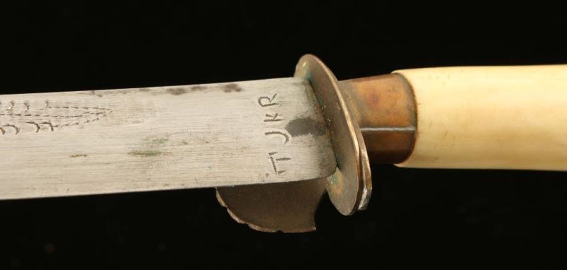 Blade is etched "TJKR". Bone handle with shell guard, 11" overall with a 7" blade includes a wooden sheath.