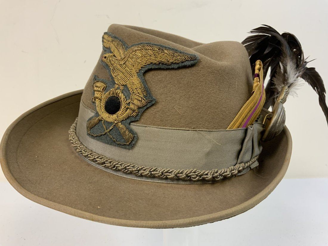 WWII ROYAL ITALIAN ARMY ALPINE DIVISION OFFICER ALPINI HAT WITH FEATHER . INTERIOR LINING IS THERE BUT FALLING OUT AND NEEDS TO BE RESTITCHED . GOOD CONDITION OVERALL . COMPLETE .-