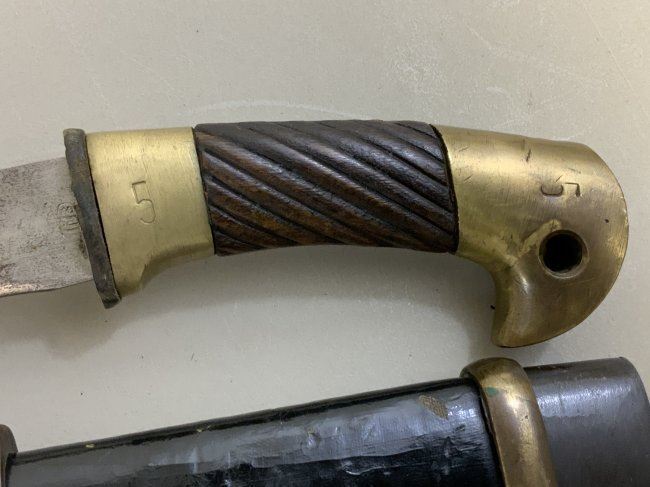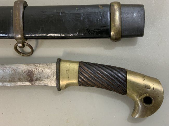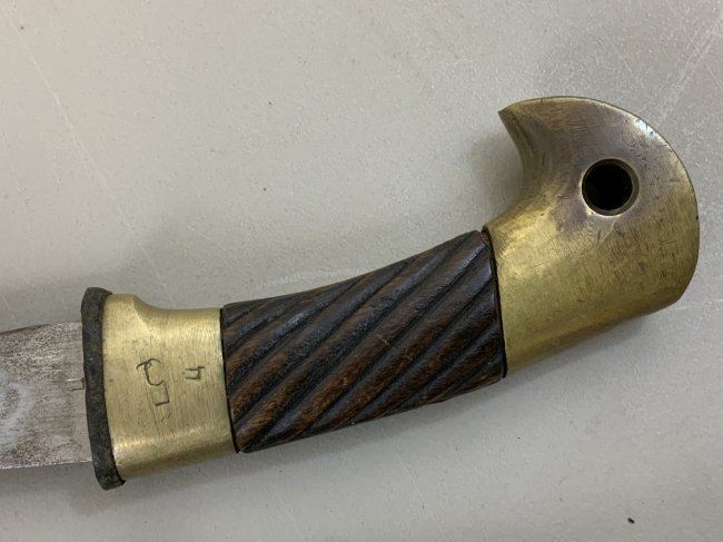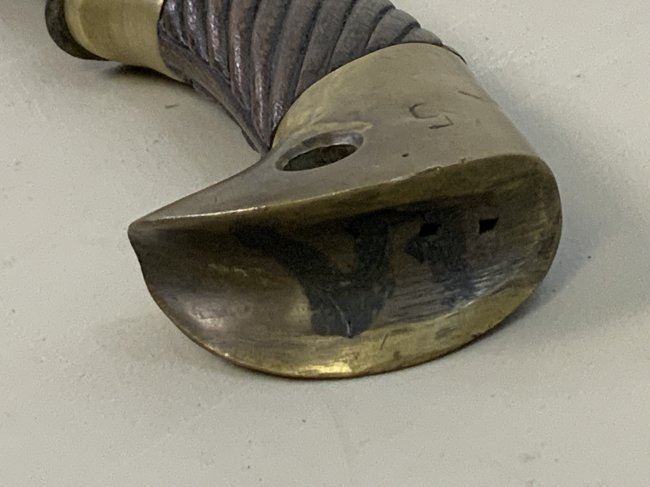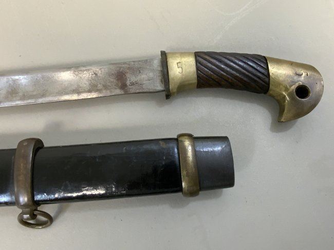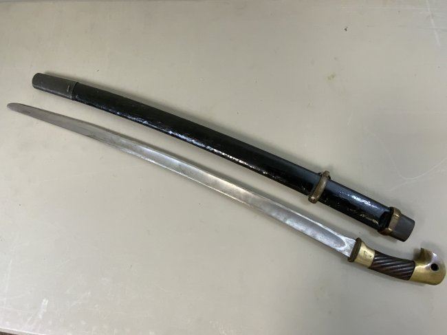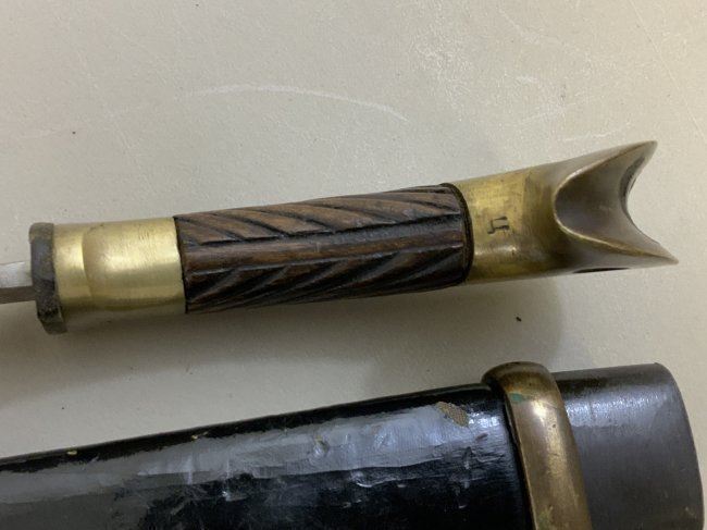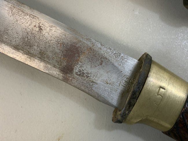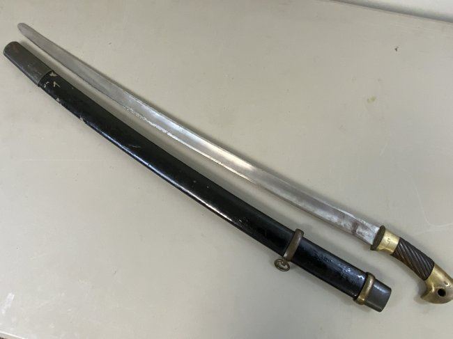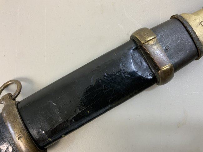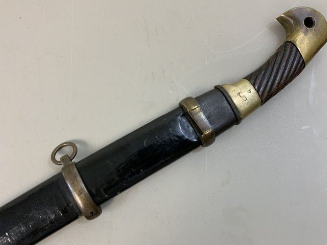 WWII SOVIET RUSSIAN M1927 CAVALRY SWORD 1945 DATED . VERY RARE FIND AS THESE 1945 MADE SWORDS ARE QUITE RARE . GREAT CONDITION OVERALL . MIX OF BRASS AND STEEL FITTINGS ON THE SCABBARD WHICH IS NORMAL FOR THIS YEAR OF PRODUCTION ALL STAMPED WITH LATER "Ц" . BLADE IS DULL AND NEVER SHARPENED WITH SOME NICKS AND DINGS AND STAMPED "ИМЗ 1945". ORIGINAL LEATHER . GREAT RARE EXAMPLE OF LATE WAR PRODUCTION SWORD.