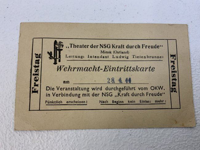 WWII GERMANY THIRD REICH RARE OCCUPIED USSR MINSK THEATER TICKET FOR MILITARY PERSONAL . VERY RARE SURVIVOR . DATED 1944. SOME DATA WRITTEN ON THE BACK.