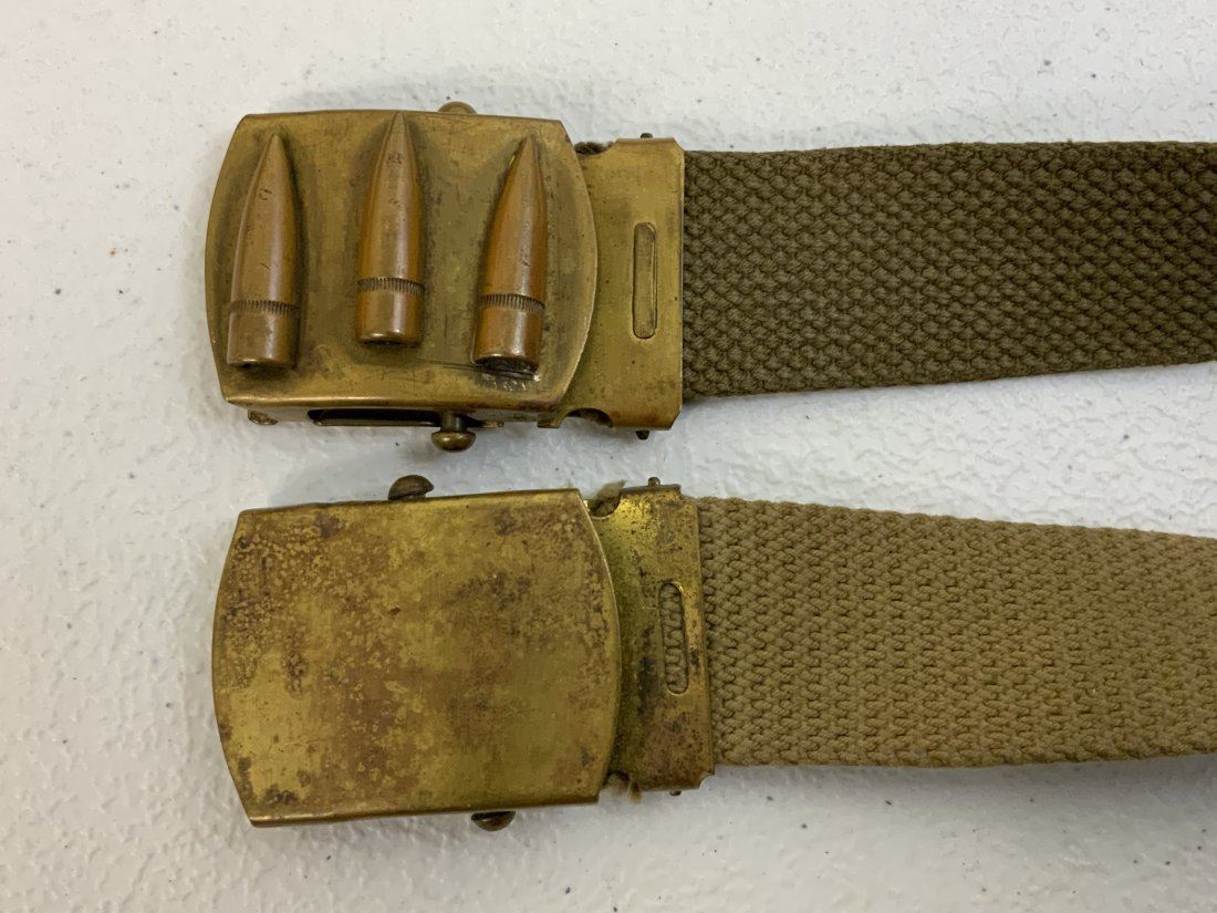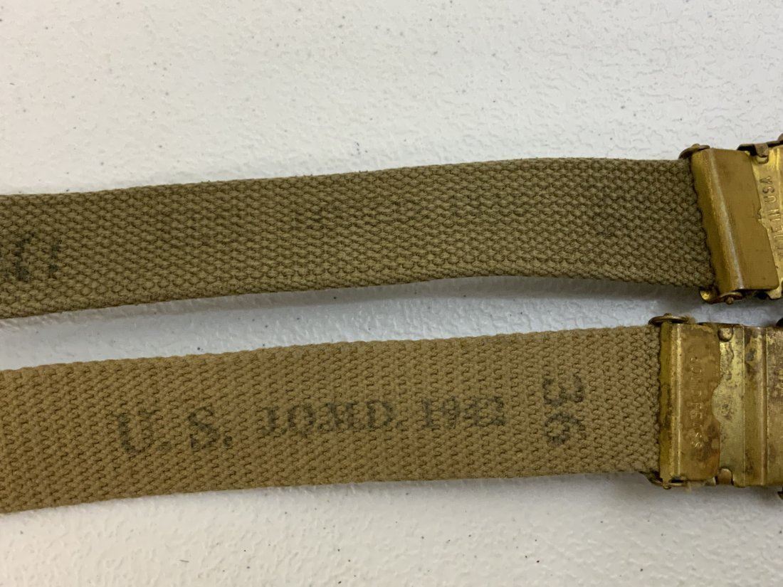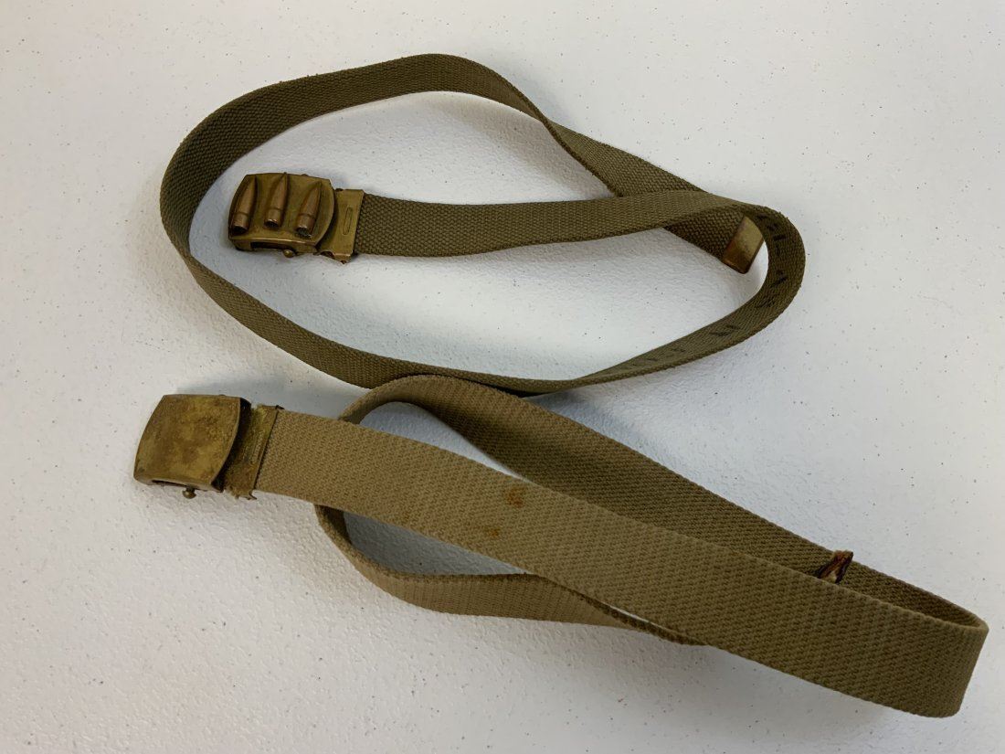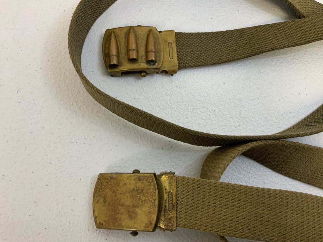 WWII US MILITARY WEB BELTS WITH BRASS BUCKLES . ONE NAMED. DATED 1943 AND 1942. SET OF 2 .