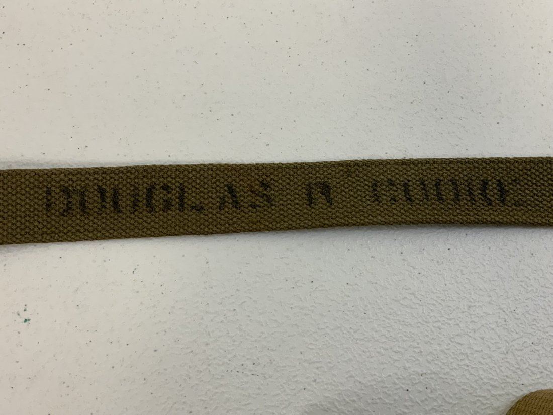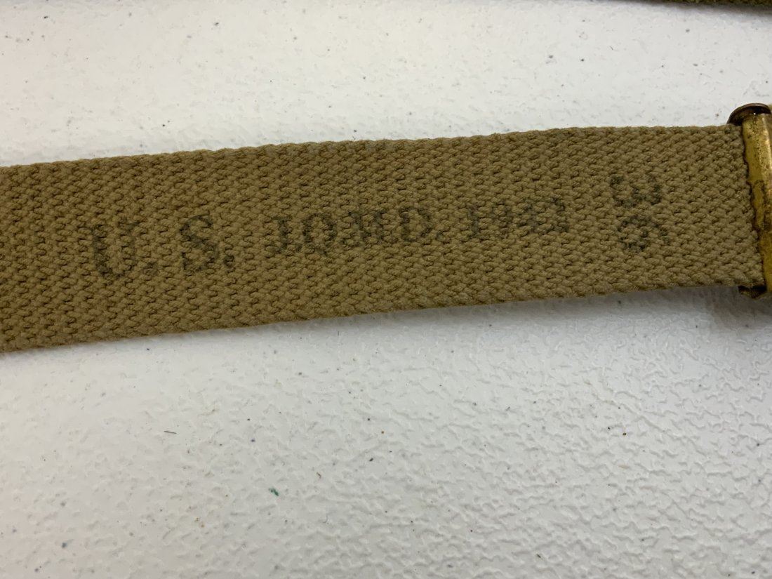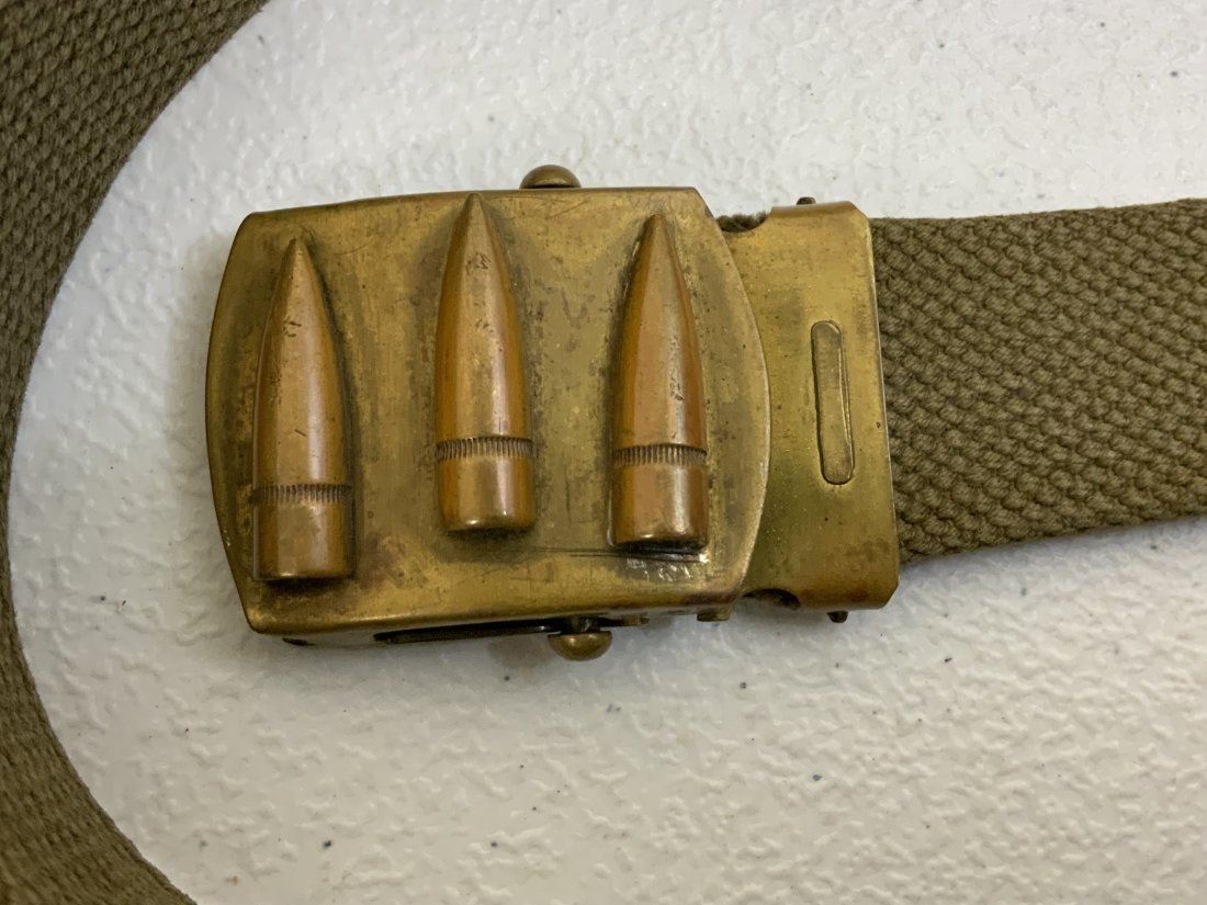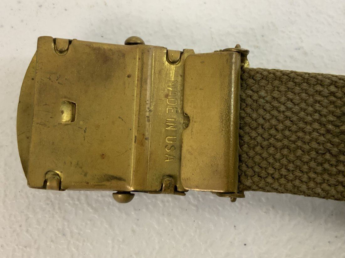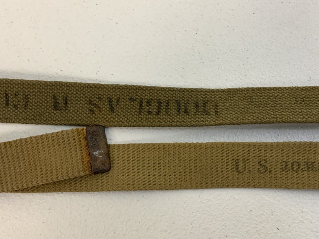 WWII US MILITARY WEB BELTS WITH BRASS BUCKLES . ONE NAMED. DATED 1943 AND 1942. SET OF 2 .