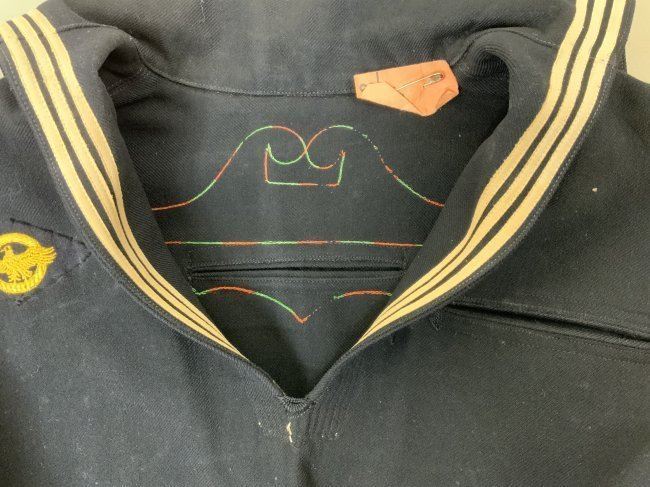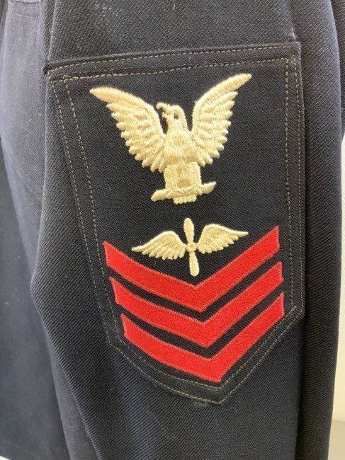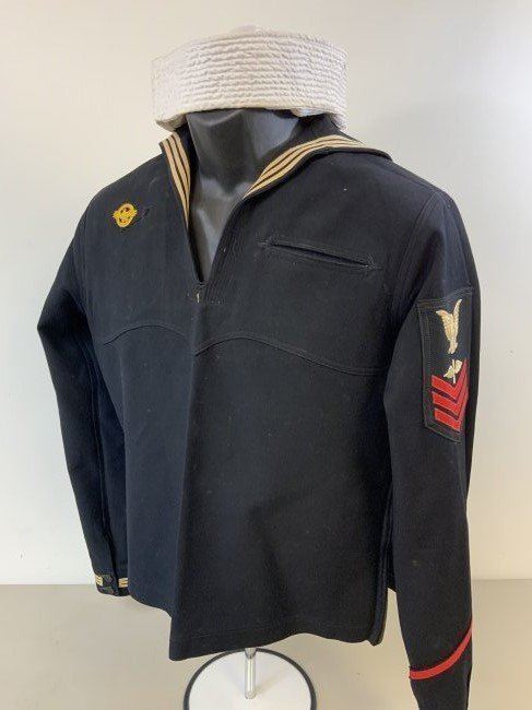 WWII US NAVY PETTY OFFICER DRESS UNIFORM JUMPER AND WHITE HAT. VERY GOOD CONDITION. SMALL SIZE . SIDE ZIPPER IS BROKEN.