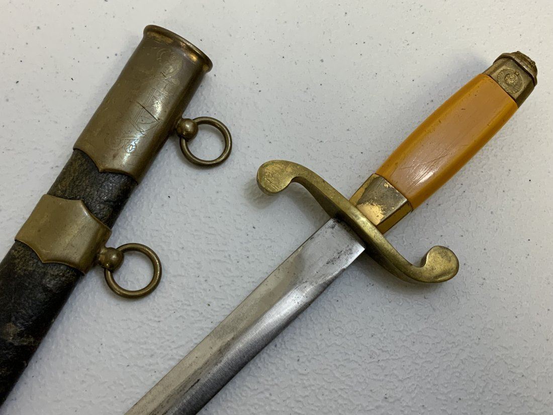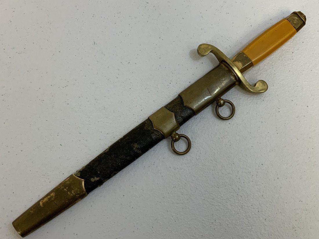 WWII USSR SOVIET UNION NAVY OFFICERS DAGGER - RARE FIND. THE EARLIEST PRODUCED MODEL . NO RELEASE BUTTON. SHALLOW ENGRAVINGS ON THE BRASS UPPER SCABBARD. ORIGINAL LEATHER WRAPPED WITH BRASS FITTINGS SCABBARD. EARLY USSR SEAL ON THE POMMEL .PLAIN UNMARKED BLADE WITH SOME SHARPENING . RARE TO FIND!
