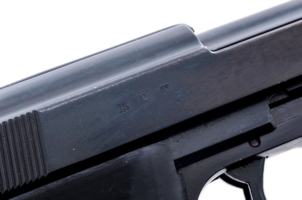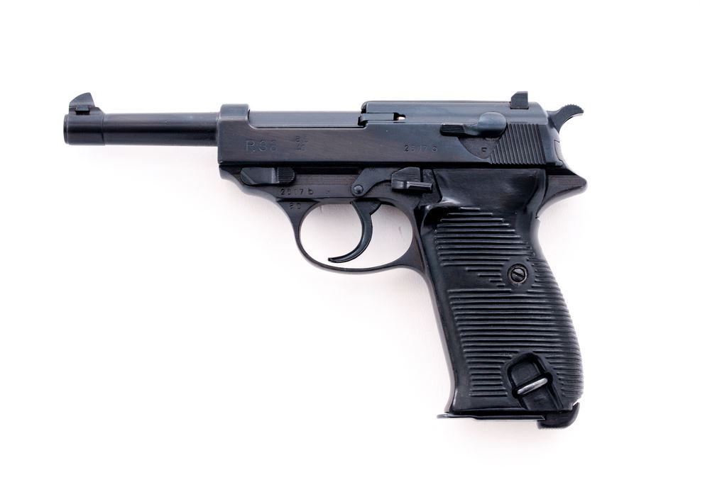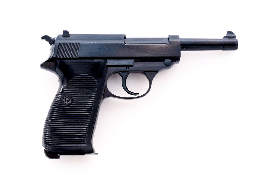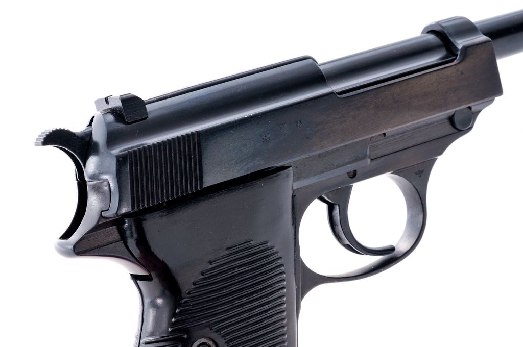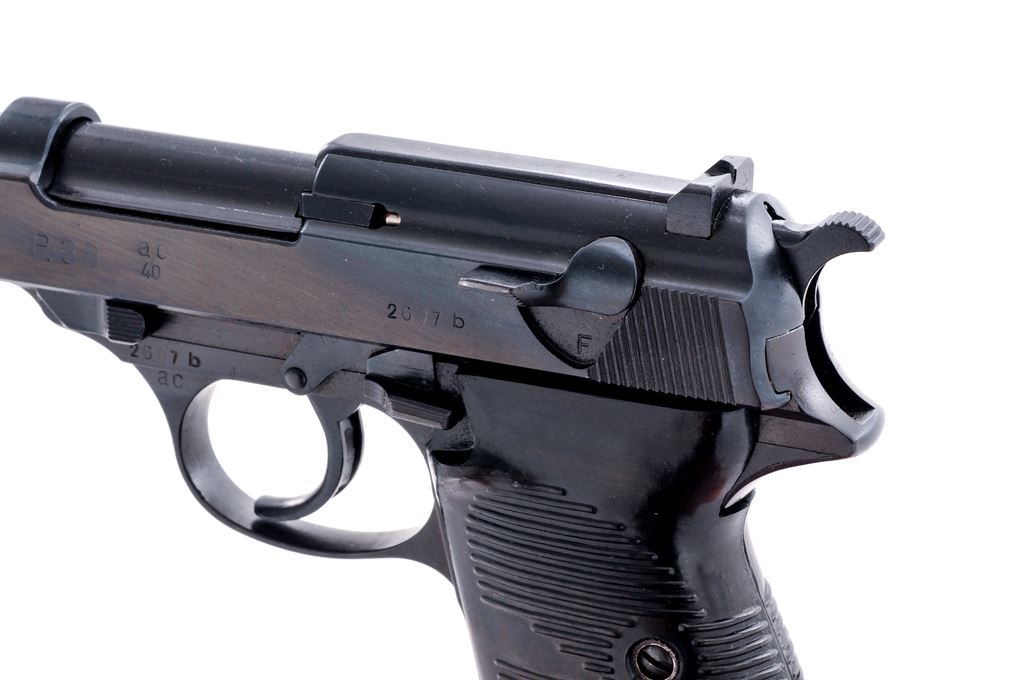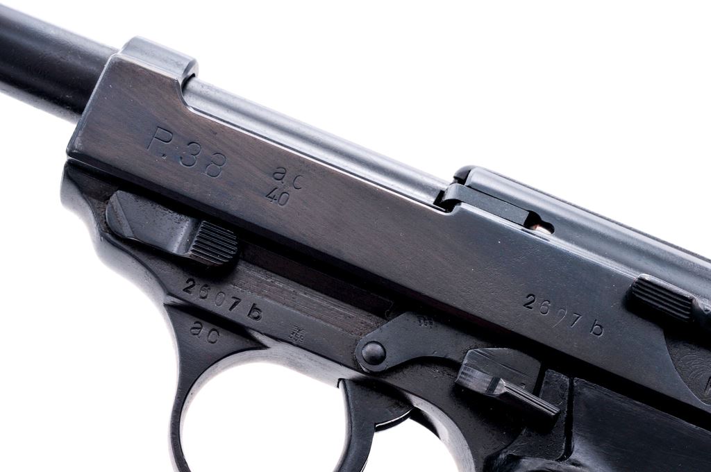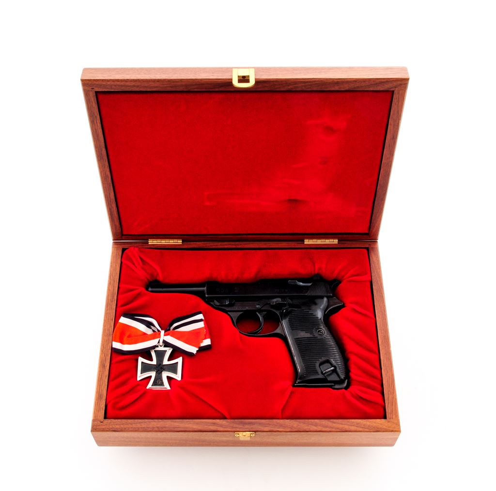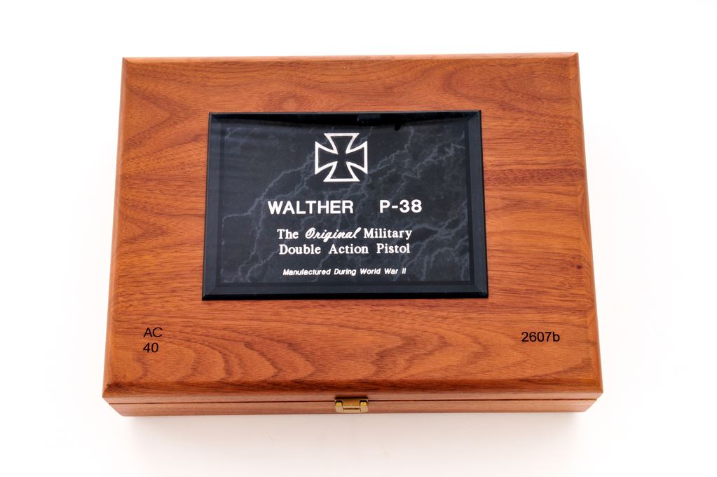 WWII Walther P.38 Semi-Automatic Pistol, (ac/40), #2607b, 9mm, 4.75'' barrel, blue finish, phenolic resin grips, with one WWII era magazine. In modern made red velvet-lined walnut fitted case, which is numbered to the pistol as is the included reproduction Iron Cross. Marble plaque on top of box marked ''Walther P-38/The Original Military Double Action Pistol/Mfg'd during WWII''. Pistol features all matching numbers, including breechblock. Condition is fine as importer refinished and retaining approx. 98% of this later blue. Markings have slightly thinned from refinishing process. Grips and action are excellent, bore is fine. Est.: $400-$600. (C&R/PPT)