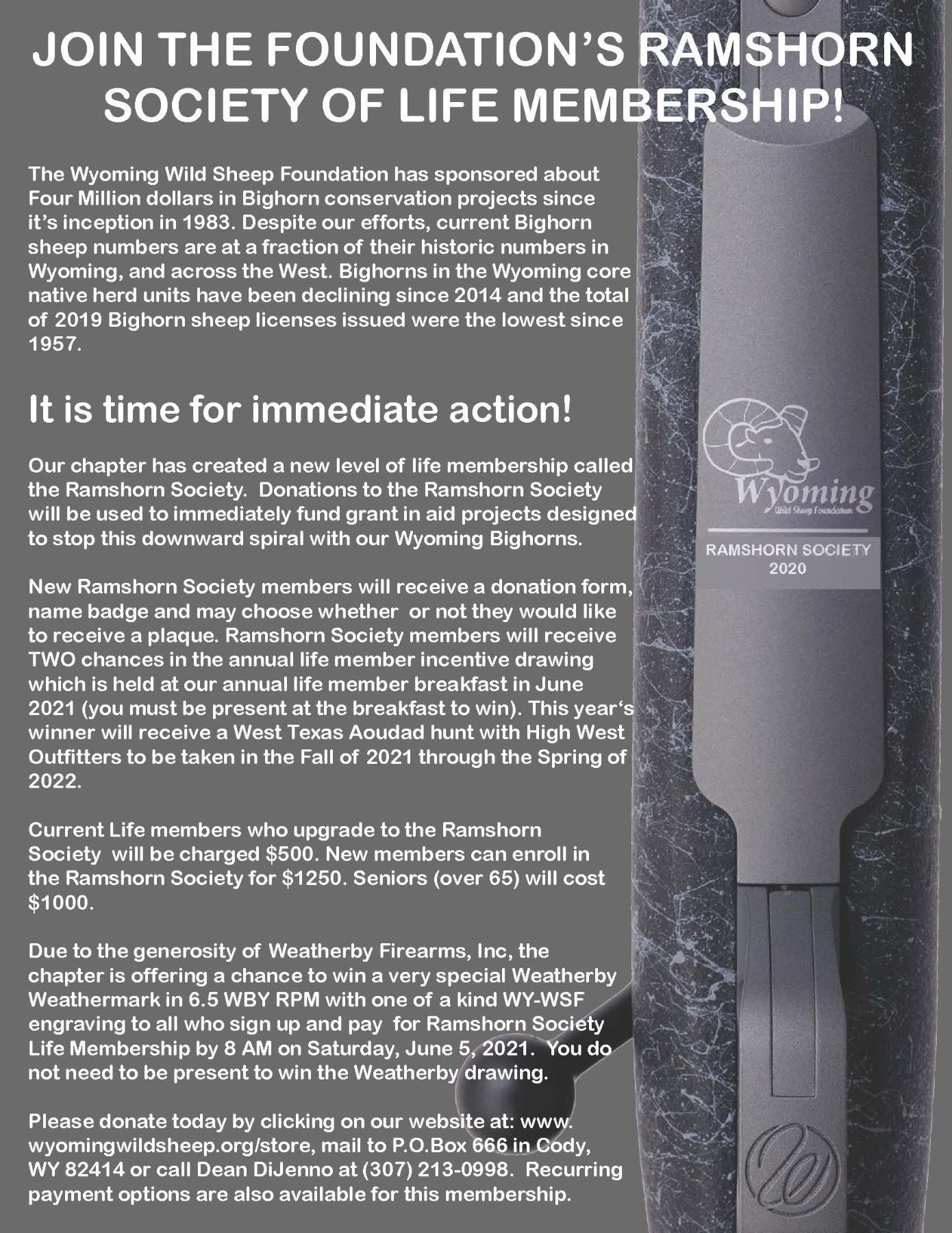 Dues of Ramshorn Society Life Members are directed to the WY-WSF Ramshorn Society Life Member Fund to maintain a small reserve with the balance being devoted to assist WY-WSF’s conservation and education initiatives.