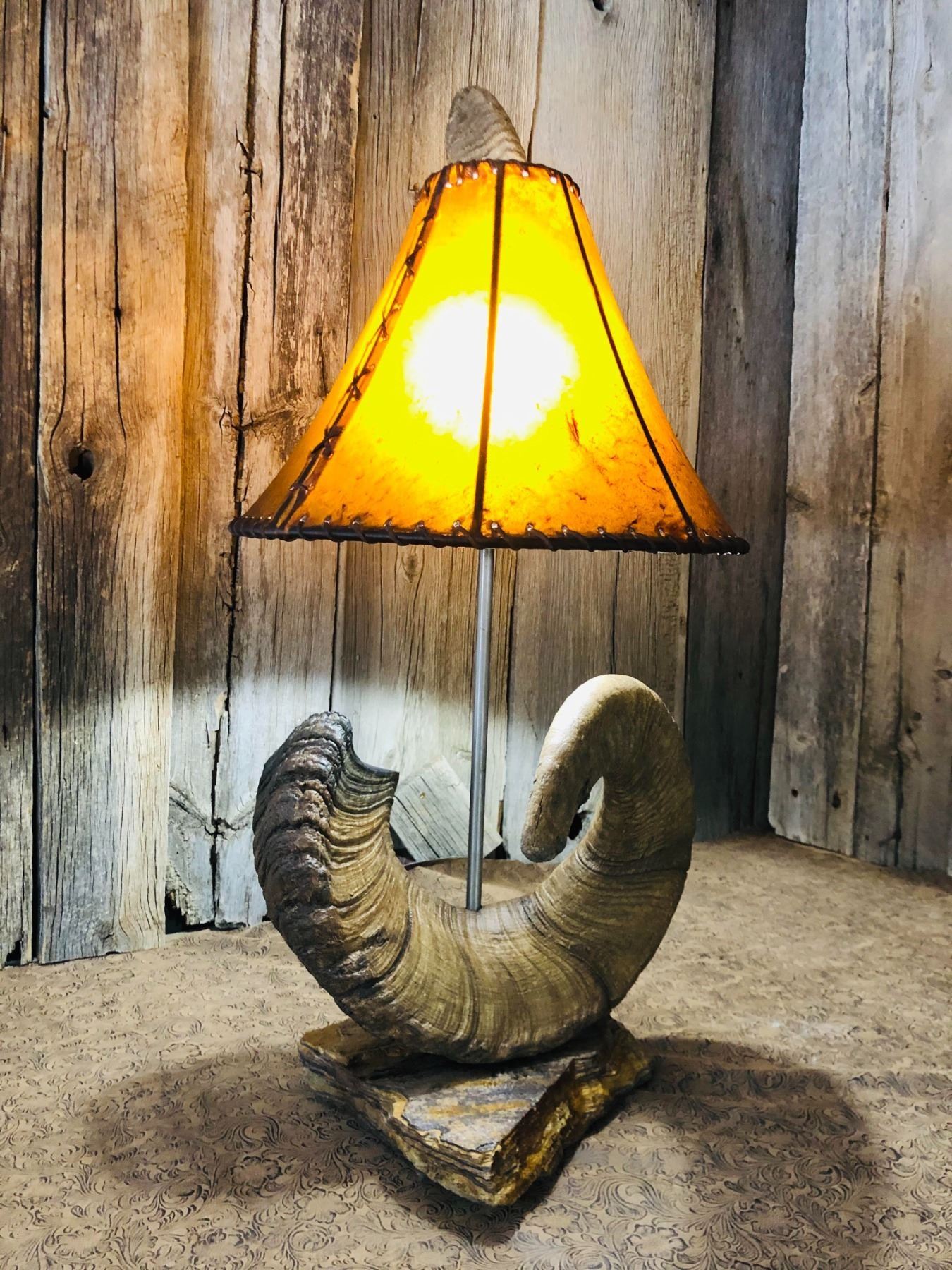 Description: Description: A Sheep Horn Table Lamp with Rawhide shade handmade by WYO Backcountry Decor.