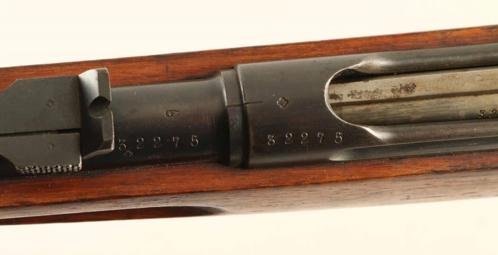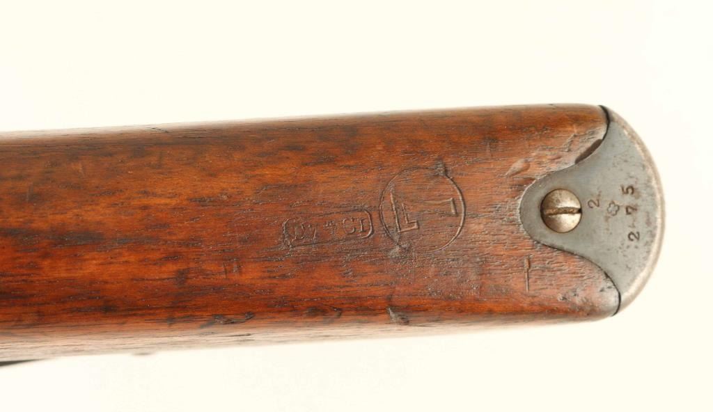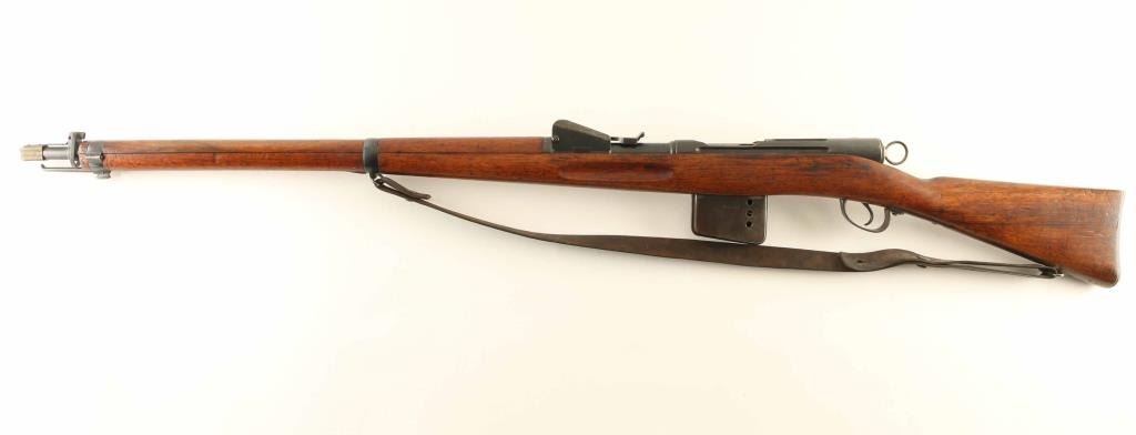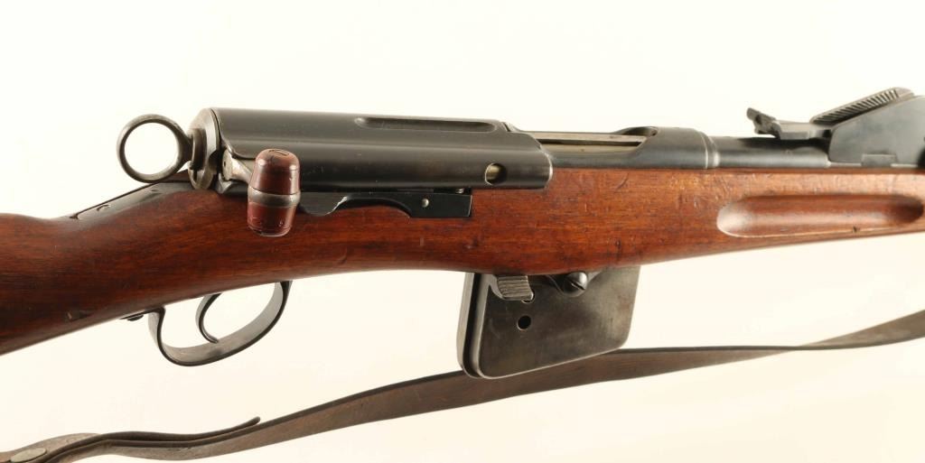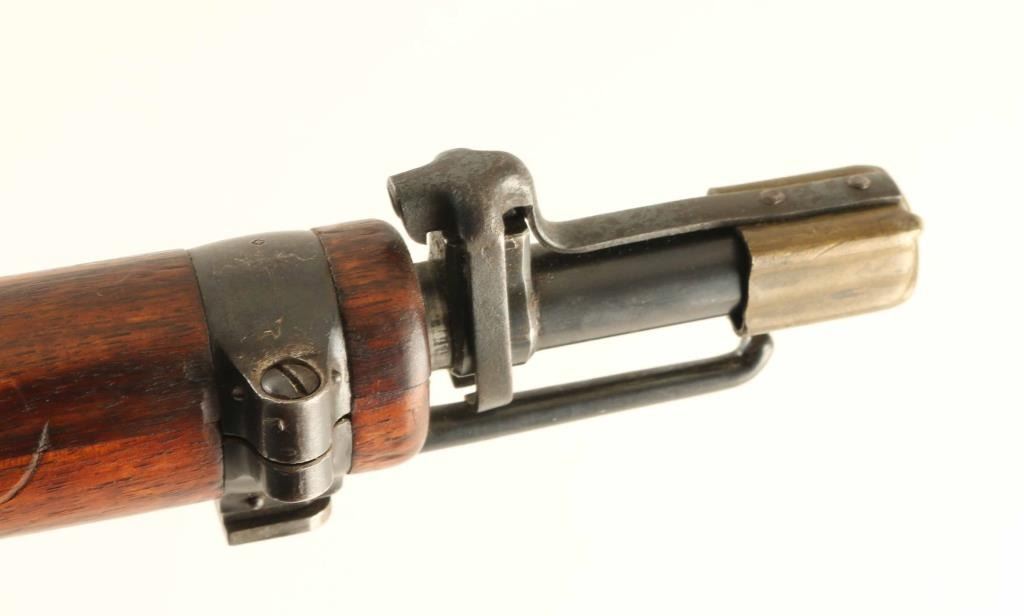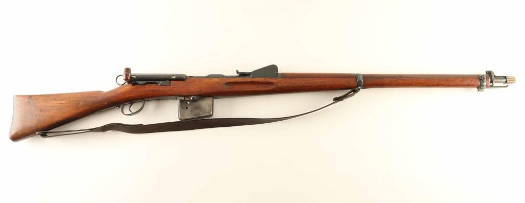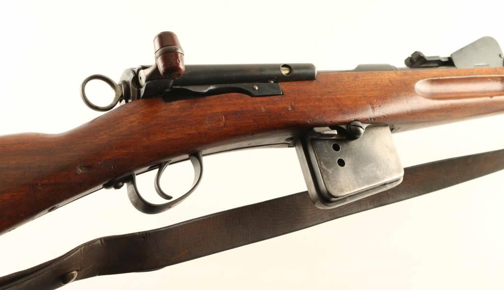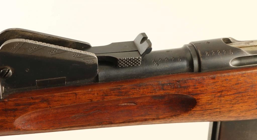 SN: 32275 Swiss military straight pull bolt action rifle. Features 30" barrel, blade front sight, tangent rear sight, bayonet lug, stacking hook, sling swivels, detachable box magazine, manual safety. Bore is good to very good condition. Metal retains 75% blued finish with thinning or bare metal at muzzle & sharp edges. Top of receiver is turning a bit gray. Magazine is mostly gray colored with much bare metal showing. Bolt is in the white, very good condition. Stock is good to very good with dents, dings, small gouges. No import marks observed. Numbers mostly match, except magazine. Includes good condition leather sling, muzzle cap. "Beer Barrel" bolt knob shows some damage to bottom of barrel. Condition is NRA Good++ *** Antique Firearm ***