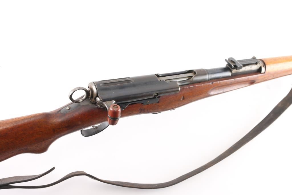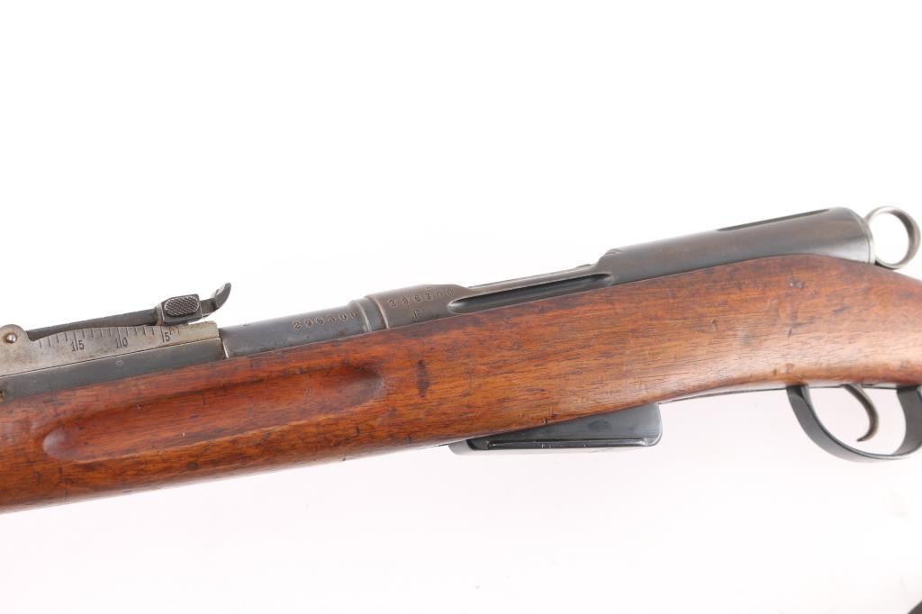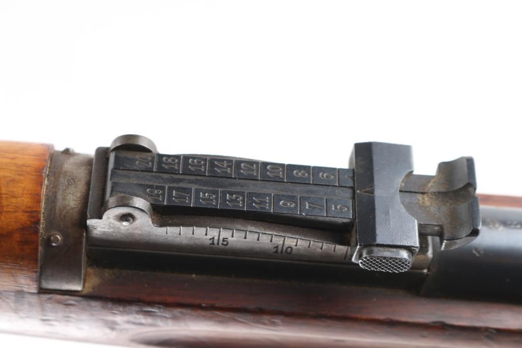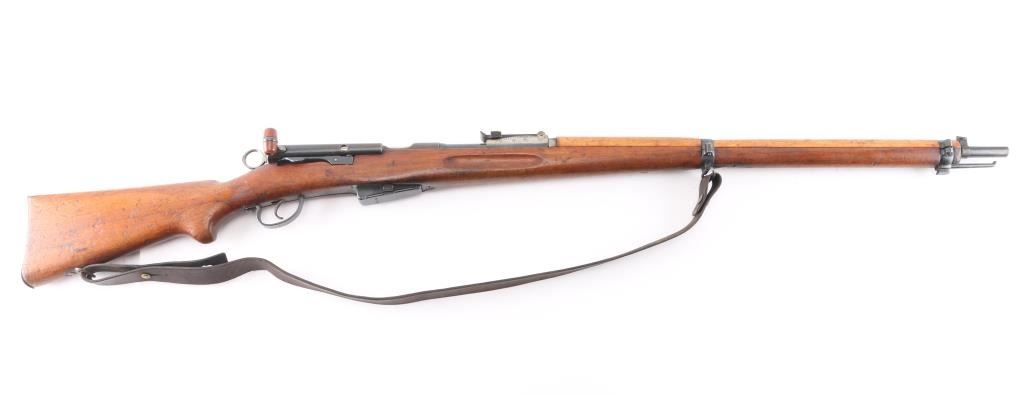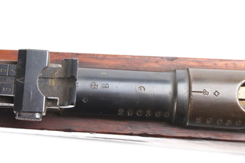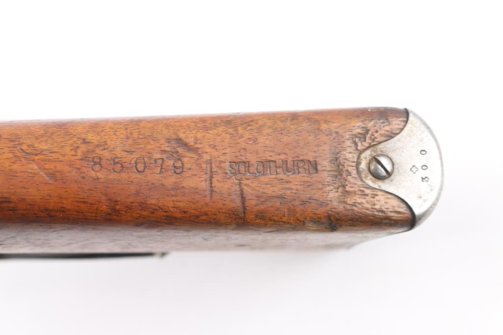 "Schmidt Rubin" Swiss military 1896 pattern magazine fed straight-pull bolt action service rifle chambered in 7.5x55mm. Modified to 1911 configuration between 1911-1920. No importer marks observed. Features a blued finish, 30.7" barrel, dovetailed patridge front sight, leaf style rear sight graduated to 2,000 meters, two barrel bands with a stacking hook & bayonet lug on the front band, smooth trigger, detachable 6 round magazine, synthetic red "beer barrel" shaped bolt handle, cocking ring, dark leather sling, smooth wood handguard and full-length shoulder stock with finger grooved forend, inlet pistol grip & smooth metal buttplate. Serial numbers match on the receiver, barrel, bolt, magazine and buttplate. The top of the stock comb is stamped "85079" & "SOLOTHURN." Rifle exhibits approximately 75% of its blued finish showing scattered wear. Action is sound, the bore is very good/bright, strong rifling and the wood stocks are good/sound.Condition is NRA Good+. C&R Firearm.