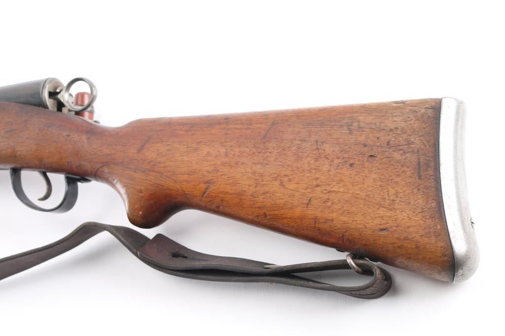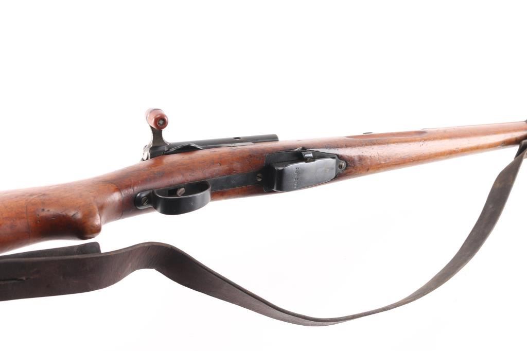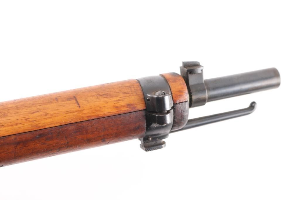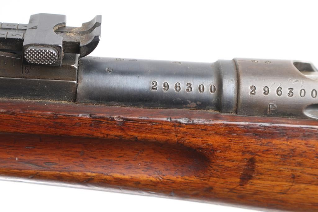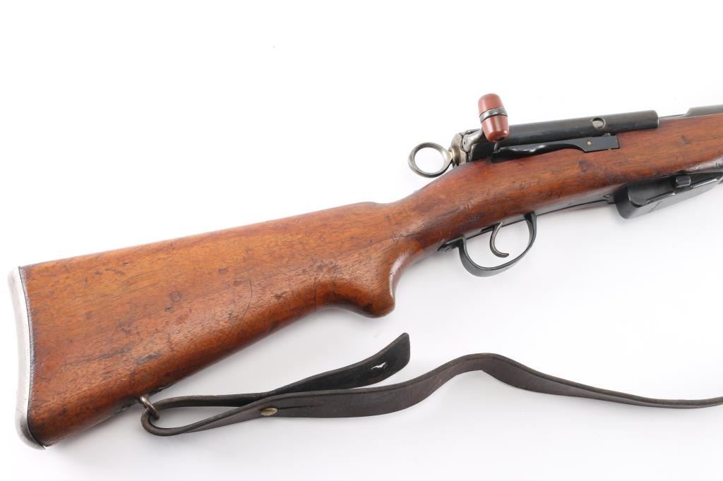 "Schmidt Rubin" Swiss military 1896 pattern magazine fed straight-pull bolt action service rifle chambered in 7.5x55mm. Modified to 1911 configuration between 1911-1920. No importer marks observed. Features a blued finish, 30.7" barrel, dovetailed patridge front sight, leaf style rear sight graduated to 2,000 meters, two barrel bands with a stacking hook & bayonet lug on the front band, smooth trigger, detachable 6 round magazine, synthetic red "beer barrel" shaped bolt handle, cocking ring, dark leather sling, smooth wood handguard and full-length shoulder stock with finger grooved forend, inlet pistol grip & smooth metal buttplate. Serial numbers match on the receiver, barrel, bolt, magazine and buttplate. The top of the stock comb is stamped "85079" & "SOLOTHURN." Rifle exhibits approximately 75% of its blued finish showing scattered wear. Action is sound, the bore is very good/bright, strong rifling and the wood stocks are good/sound.Condition is NRA Good+. C&R Firearm.