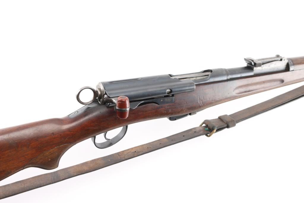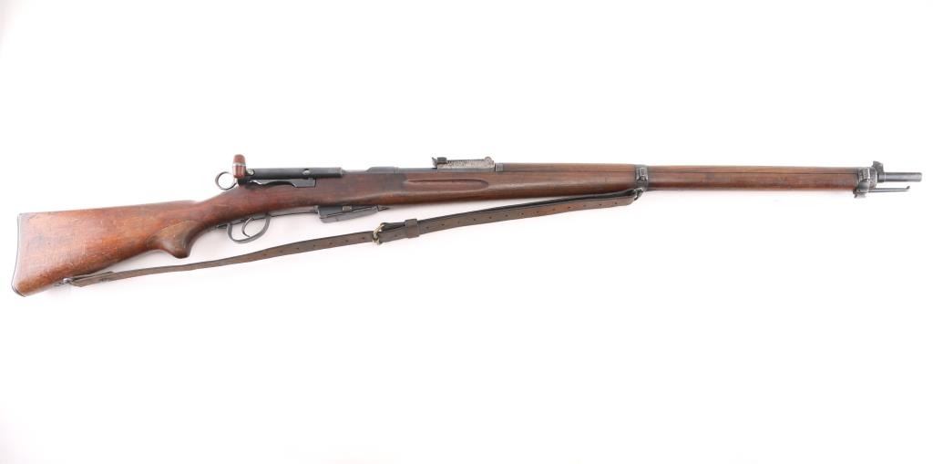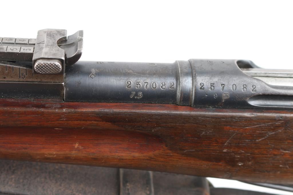 "Schmidt Rubin" Swiss military 1896 pattern magazine fed straight-pull bolt action service rifle chambered in 7.5x55mm. Manufactured circa 1900 and modified to 1911 configuration between 1911-1920. No importer marks observed. Features a blued finish, 30.7" barrel, dovetailed patridge front sight, leaf style rear sight graduated to 2,000 meters, two barrel bands with a stacking hook & bayonet lug on the front band, smooth trigger, detachable 6 round magazine, synthetic red "beer barrel" shaped bolt handle, cocking ring, dark leather sling, smooth wood handguard and full-length shoulder stock with finger grooved forend, inlet pistol grip & smooth metal buttplate. Serial numbers match on the receiver, barrel, bolt, magazine and buttplate. The top of the stock is marked "94159" & "GLARUS." Rifle exhibits approximately 60% of it's blued finish showing scattered wear and a small amount of surface rust & dark pitting. Action is sound, the bore appears excellent and the wood stocks are good. Condition is NRA Good+ *** C&R Firearm ***