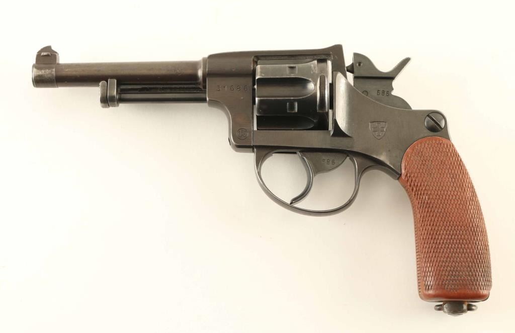 Swiss military double action service revolver chambered in 7.5mm, manufactured by Waffenfabrik Bern circa 1882-1929. Features a blued finish, 4.5" barrel, blade front sight, 'u' notched rear sight, fluted six-shot cylinder, flip down loading gate, ejector rod, smooth trigger, knurled low-profile hammer spur, lanyard ring and two-piece checkered plastic grips. All visible serial numbers are matching and markings are crisp. No importer marks observed. Bore is very good. Retains over 90% blue with loss at sharp edges and where moving parts rub. Several small impact marks on left side of barrel and frame immediately behind. Barrel bluing is slightly brown colored. Grips are fair serviceable condition with chip missing at butt. Action is mechanically sound. Condition is NRA Very Good+ *** C&R Firearm ***