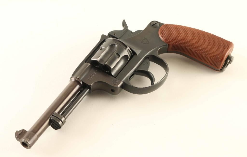 Swiss military double action service revolver chambered in 7.5mm, manufactured by Waffenfabrik Bern circa 1882-1929. Features a blued finish, 4.5" barrel, blade front sight, 'u' notched rear sight, fluted six-shot cylinder, flip down loading gate, ejector rod, smooth trigger, knurled low-profile hammer spur, lanyard ring and two-piece checkered plastic grips. All visible serial numbers are matching and markings are crisp. No importer marks observed. Stamped on left side of frame "P-31" with hand stamp, "3" is very lightly struck. Bore is very good. Retains 97% blue with some loss at sharp edges, scuffing to left side of frame behind barrel. Barrel bluing is slightly reddish or plum colored. Grips are fine and action is mechanically sound. Condition is NRA Very Good++ *** C&R Firearm ***