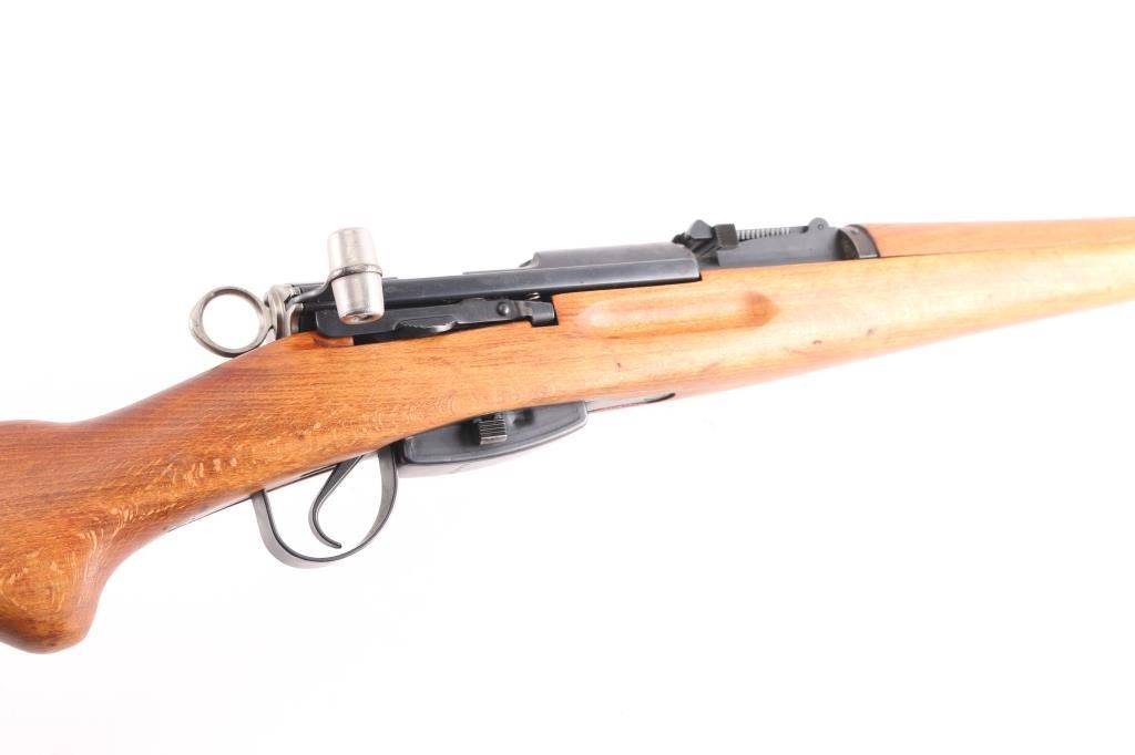 SN: 904418. Schmidt–Rubin' Swiss military straight pull bolt action rifle imported by PW Arms, marked on rear sight. Features blued finish, wood semi pistol grip stock, 25" barrel, bayonet lug, stacking hook, blade front sight inside protective ears, tangent rear sight, sling swivels, detachable magazine, "beer barrel" shaped aluminum bolt knob. Swiss cross in shield on chamber. Bore is excellent/bright. Retains about 95% coverage of blued finish, showing edge losses & handling marks. Bolt assembly is mostly bright polished, some blued pieces, overall in very good condition. Stock is excellent. Original serial number matched on receiver, barrel, bolt, magazine.