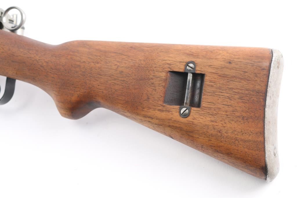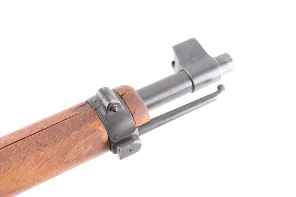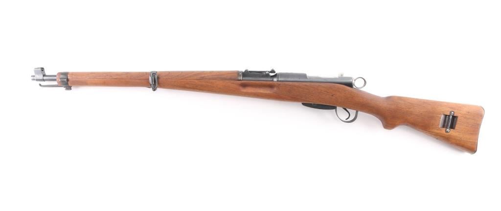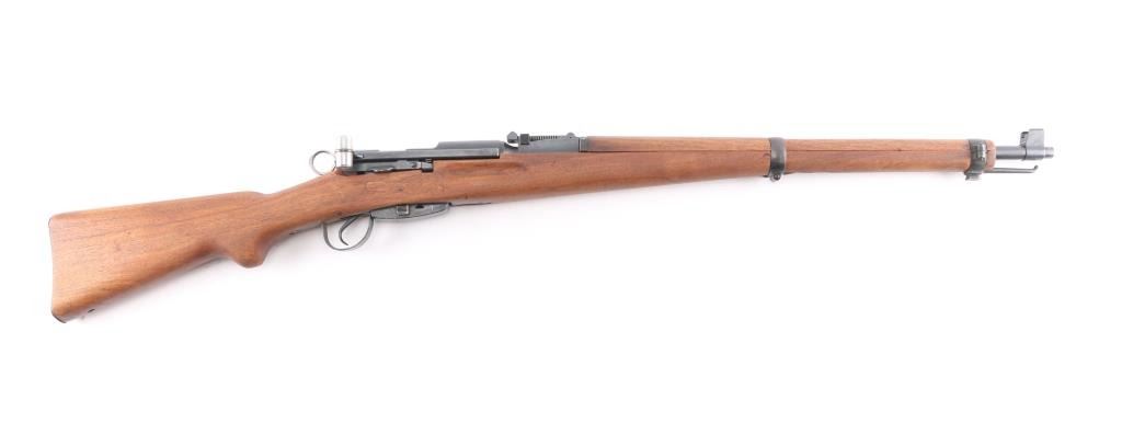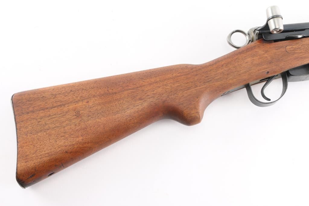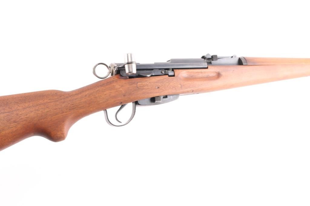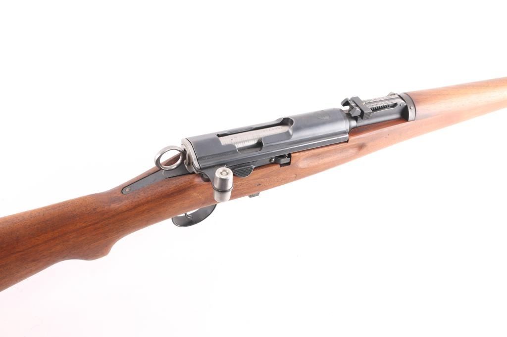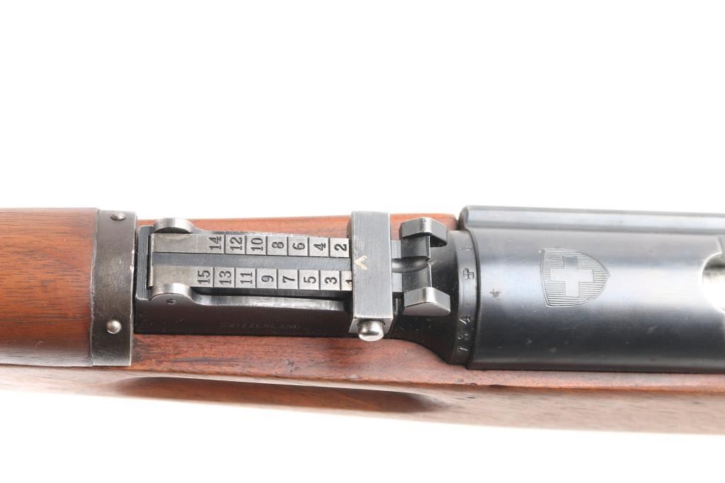 SN: 561734. Schmidt–Rubin' Swiss military straight pull bolt action rifle imported by PW Arms, marked on rear sight. Features blued finish, wood semi pistol grip stock, 25" barrel, bayonet lug, stacking hook, blade front sight inside protective ears, tangent rear sight, sling swivels, detachable magazine, "beer barrel" shaped aluminum bolt knob. Swiss cross in shield on chamber. Bore is excellent/bright. Retains about 95% coverage of blued finish, showing edge losses & handling marks. Bolt assembly is mostly bright polished, some blued pieces, overall in very good condition. Stock is excellent Original serial number matched on receiver, barrel, bolt, magazine.