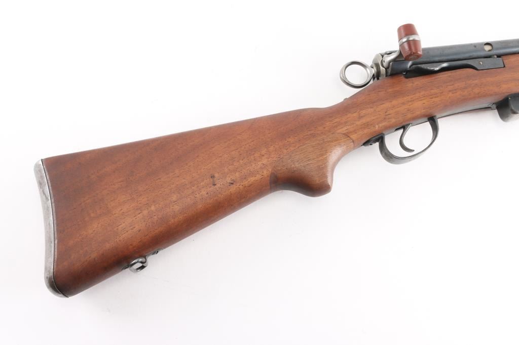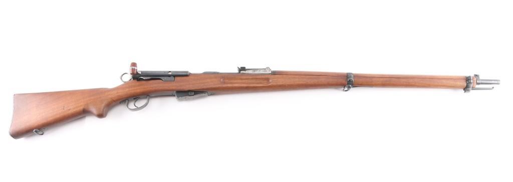 SN: 224617. "Schmidt Rubin" Swiss military 1896 pattern magazine fed straight-pull bolt action service rifle chambered in 7.5x55mm. Modified to 1911 configuration between 1911-1920.Imported by PW Arms marked on the left receiver. Features a blued finish, 30.7" barrel, dovetailed patridge front sight, leaf style rear sight graduated to 2,000 meters, two barrel bands with a stacking hook & bayonet lug on the front band, smooth trigger, detachable 6 round magazine, synthetic red "beer barrel" shaped bolt handle, cocking ring, smooth wood handguard and full-length shoulder stock with finger grooved forend, inlet pistol grip & smooth metal buttplate. Privatized in 1936, with the Swiss soldier retaining it, left receiver stamped P-36. Serial numbers match on the receiver, barrel, bolt, magazine and buttplate. Rifle exhibits approximately 80% of it's blued finish showing handling wear on the floorplate, triggerguard. Action is sound, the bore appears excellent and the wood stocks are very good.