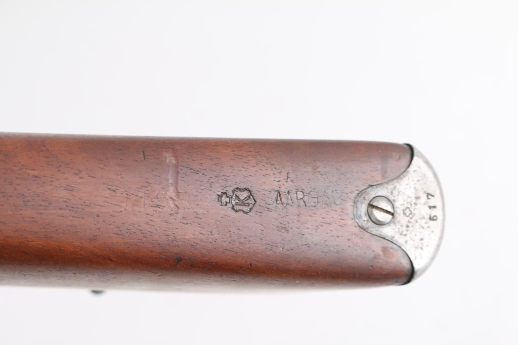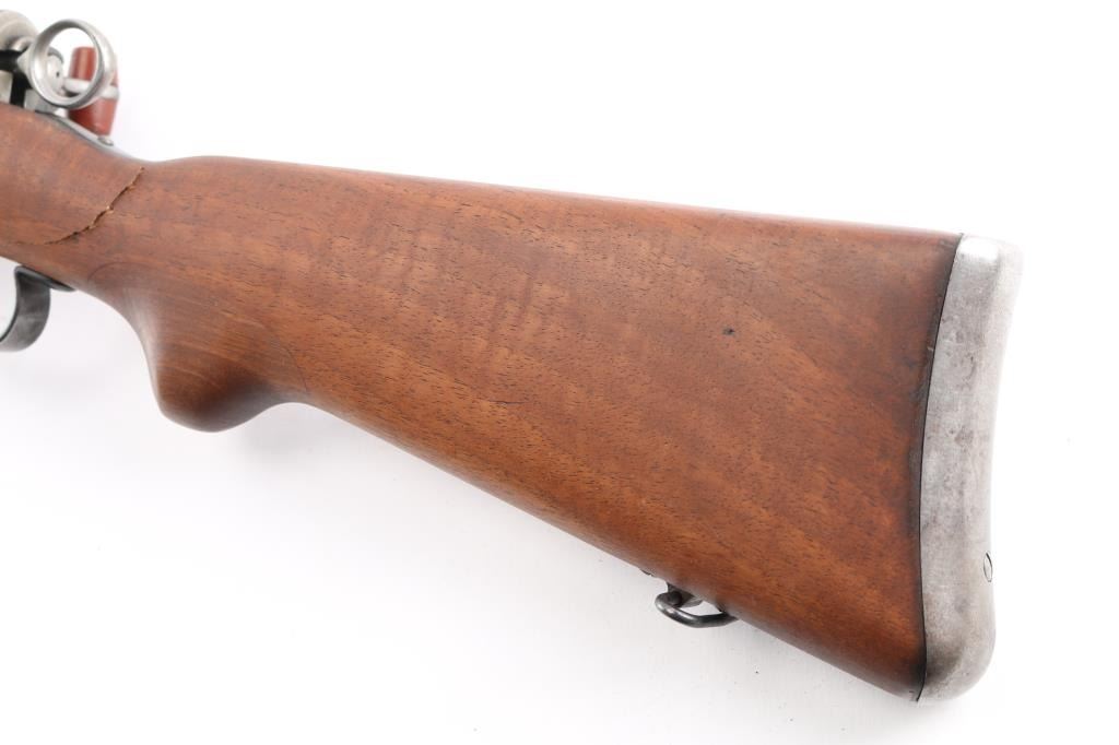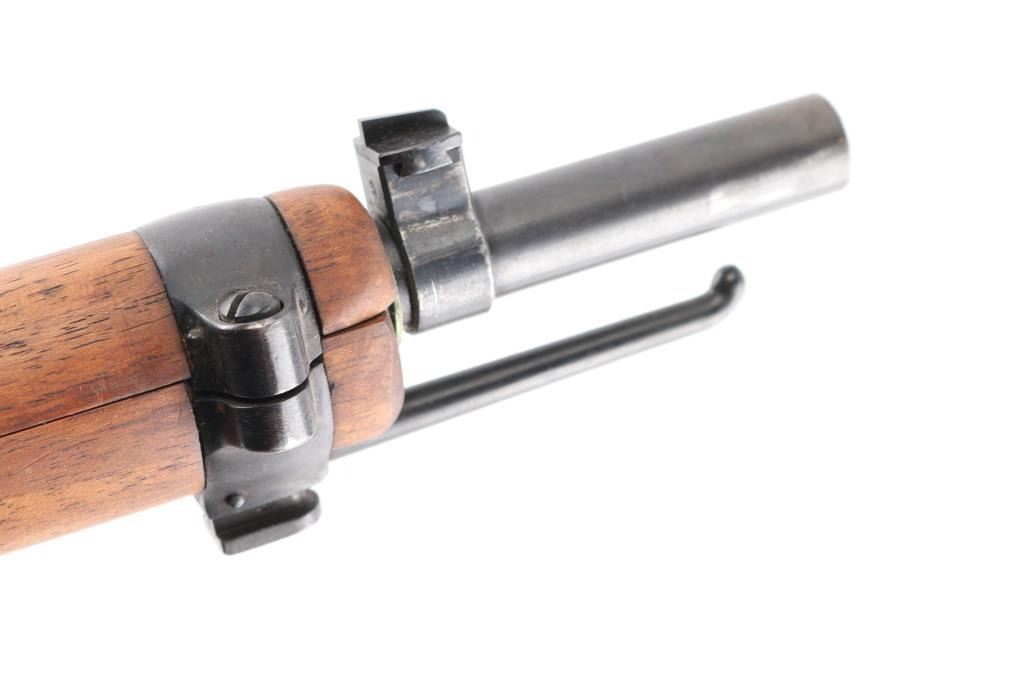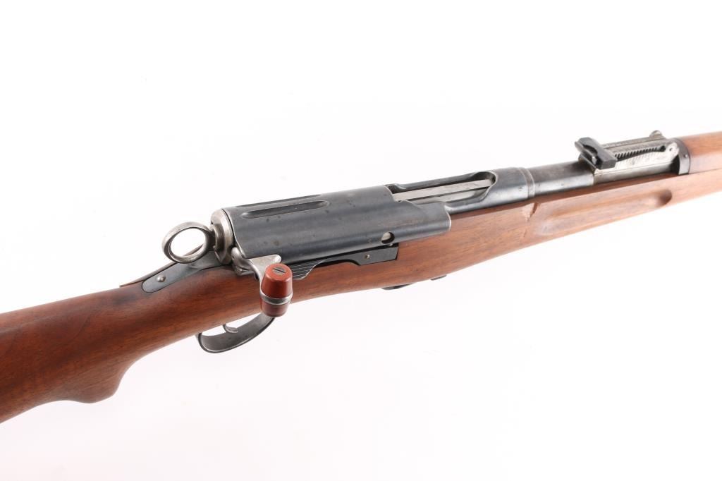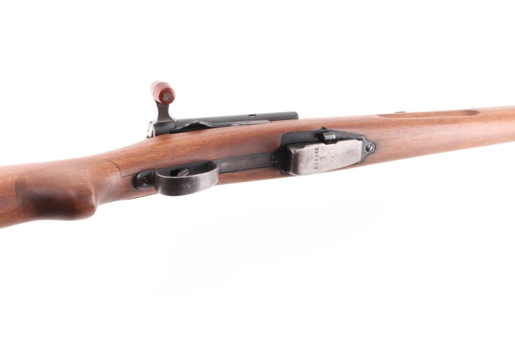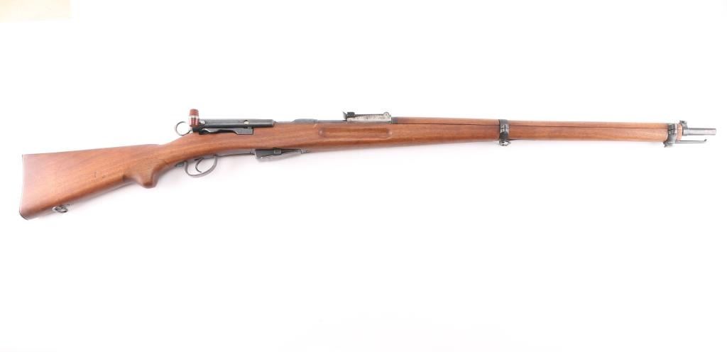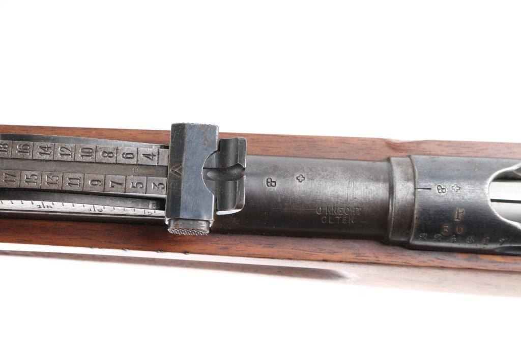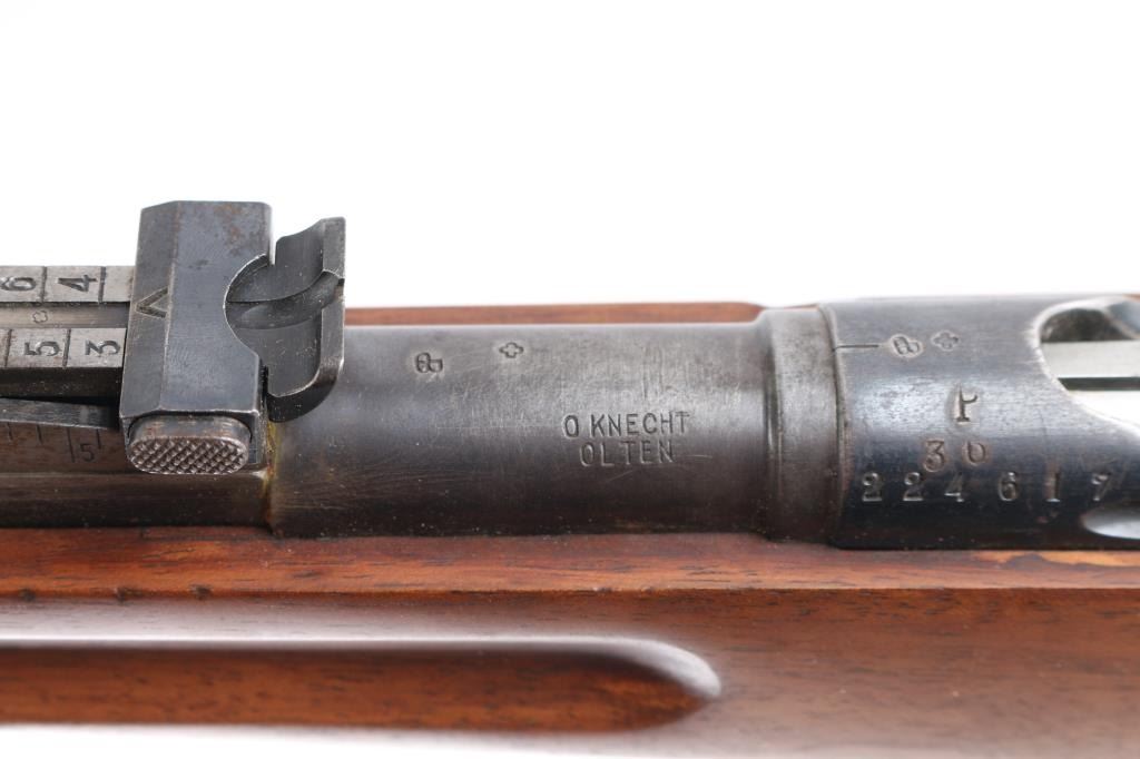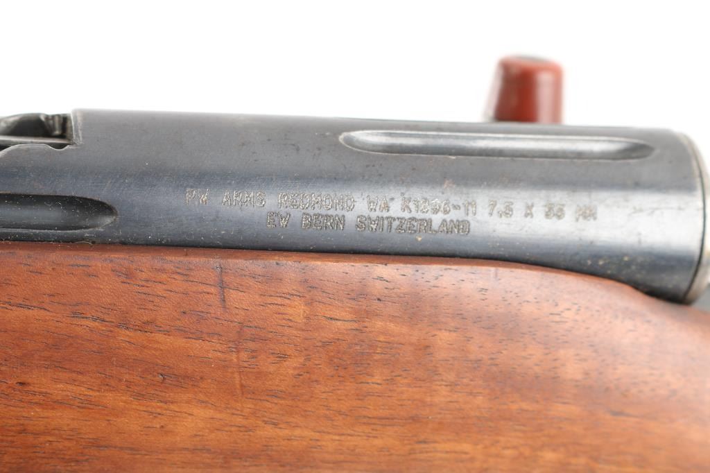 SN: 224617. "Schmidt Rubin" Swiss military 1896 pattern magazine fed straight-pull bolt action service rifle chambered in 7.5x55mm. Modified to 1911 configuration between 1911-1920.Imported by PW Arms marked on the left receiver. Features a blued finish, 30.7" barrel, dovetailed patridge front sight, leaf style rear sight graduated to 2,000 meters, two barrel bands with a stacking hook & bayonet lug on the front band, smooth trigger, detachable 6 round magazine, synthetic red "beer barrel" shaped bolt handle, cocking ring, smooth wood handguard and full-length shoulder stock with finger grooved forend, inlet pistol grip & smooth metal buttplate. Privatized in 1936, with the Swiss soldier retaining it, left receiver stamped P-36. Serial numbers match on the receiver, barrel, bolt, magazine and buttplate. Rifle exhibits approximately 80% of it's blued finish showing handling wear on the floorplate, triggerguard. Action is sound, the bore appears excellent and the wood stocks are poor with break at the wrist.