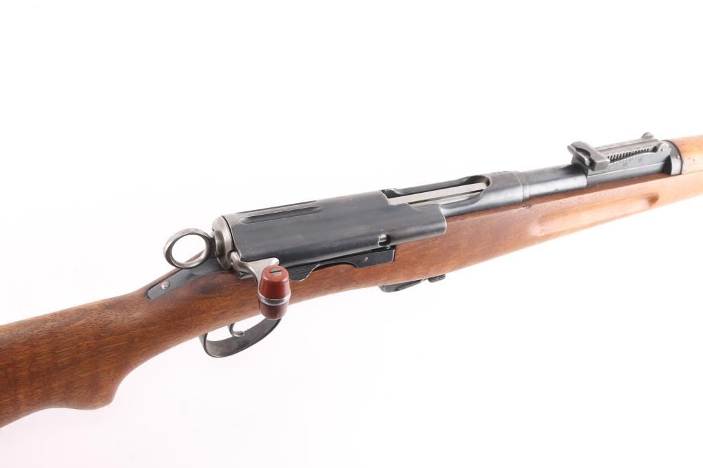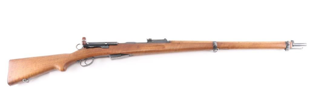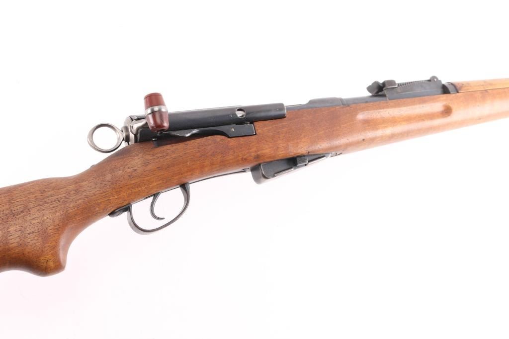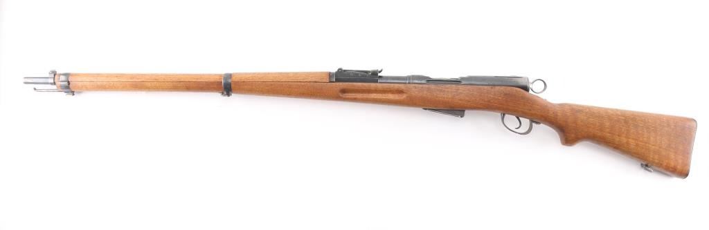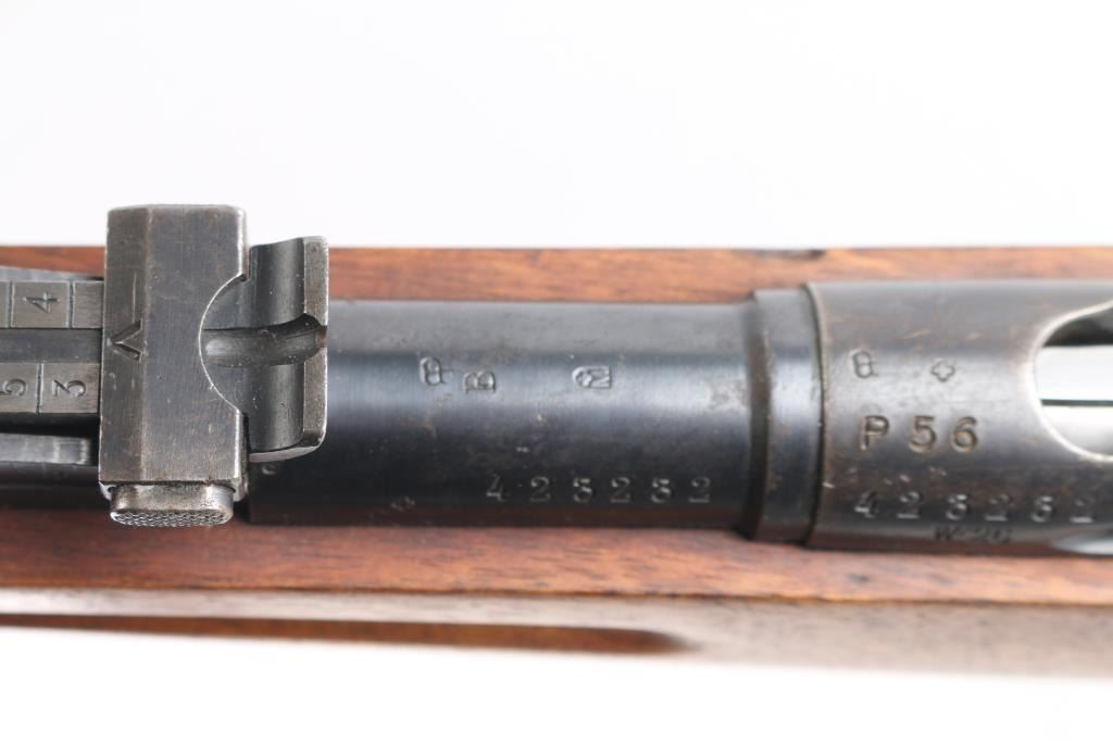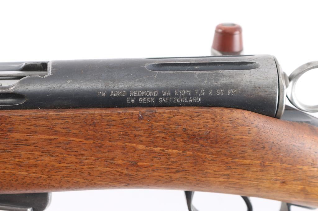 SN: 432232. Vintage Swiss Schmidt-Rubin military straight-pull bolt action service rifle features blued finish, 30.7" barrel, dovetailed patridge front sight, tangent style rear sight graduated to 2,000 meters, two barrel bands with a stacking hook & bayonet lug on the front band, smooth trigger, detachable 6 round magazine, synthetic red barrel shaped bolt handle, cocking ring, smooth wood handguard and full-length shoulder stock with finger grooved forend, partial pistol grip & smooth metal buttplate. Imported by PW Arms, marked on the left receiver. Privatized in 1956, with the Swiss soldier retaining it, left receiver stamped P-56. Serial numbers match on the receiver, barrel, bolt, and magazine. Swiss cross proofs, Bore is excellent/bright. Retains about 80% blue, with wear on the barrel, triggerguard, & magazine, bands. Wood is good solid condition with with some minor scratches/dings, action is smooth.