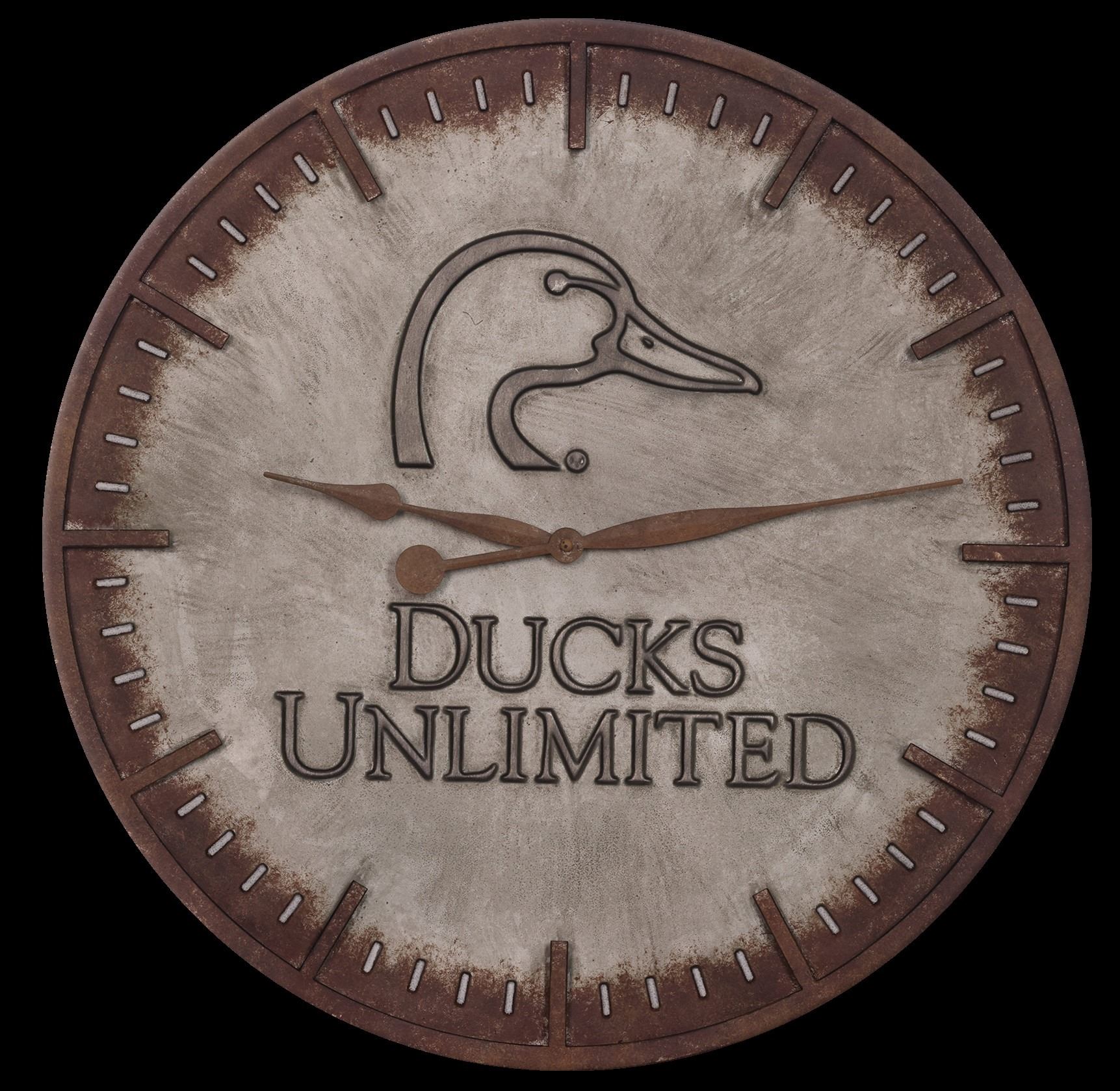 The Rustic Wall Clock is a 24” round timepiece that combines functionality with vintage charm. It features an aged pewter and rust finish, giving it a rustic, timeless appeal. The raised tick marks are painted in a white finish, ensuring both easy readability and a stylish contrast against the clock's weathered backdrop. Adding to its distinctive character, the clock is branded with the Ducks Unlimited logo, making it a perfect blend of practical decor and brand pride. This clock is an ideal addition to any space seeking a touch of rustic elegance.