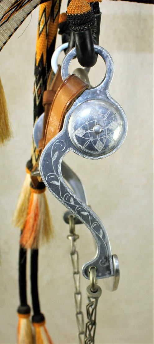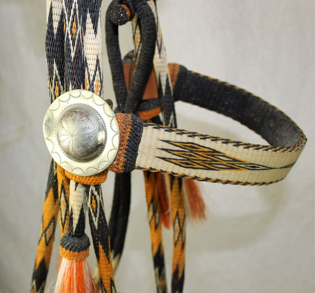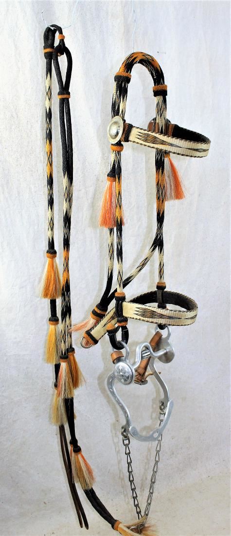 Unusual prison made horsehair bridle with orange and black predominant colors, uniquie nose band and fantastic tasseled reins. Accented by engraved "S" shank aluminum bit and sterling rosettes. In near mint condition. Circa 1930.
