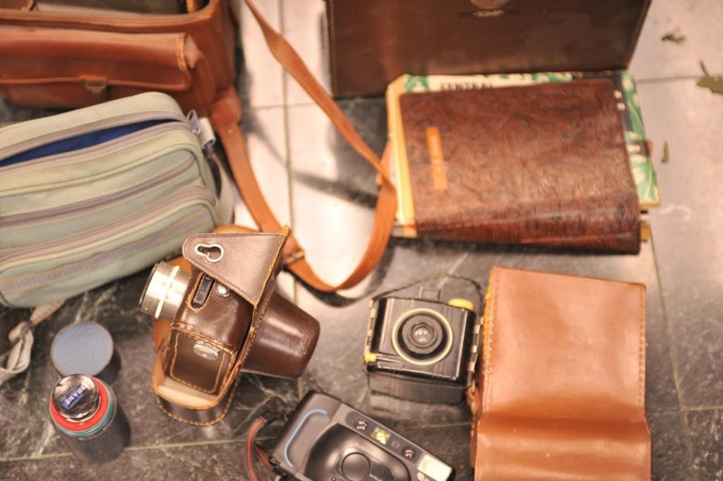 Walter Crane photographer, Collection of Cameras, 2102 W. Almond Avenue, Orange, California, from WWII to the 1980’s. The lot includes: a Zeiss Ikon-Ricolette, Exaakta Varex-Dresden, Yashica Twin-lens Reflex,MAT-124G with case and accessories in almost fine condition, Honeywell Pentax by Asahi of Japan with 4 lenses and case, an early Polaroid Land camera with case and instructions, 2 Olympus 35 EC, Kodak 1913 Ptvest pocket almost fine, Bell & Howell 220 8mm, six various makers and formats, Cannon 700 EOS lens in box, almost unused condition with various extras. Est.: $300-$3,000).