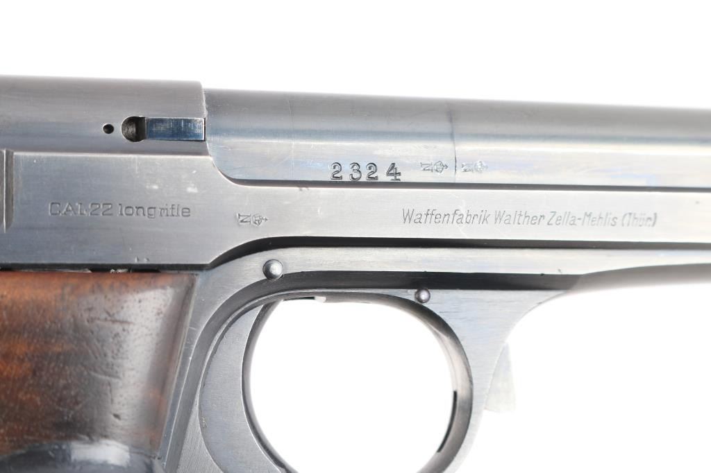 Standard configuration Walther 1925 Olympia with adjustable front and drift rear sight having 7.5 barrel with open slide. Usual Walther markings on left and right sides of slide. Triple set of Crown/N proofs on right side of slide, barrel and frame. Checkered wood grips with custom made additional target thumb rest, black paint has worn on edges. Mag is marked “28”. Bore is excellent. Retains 95% with edge wear. Condition is NRA Very Good. C & R Firearm