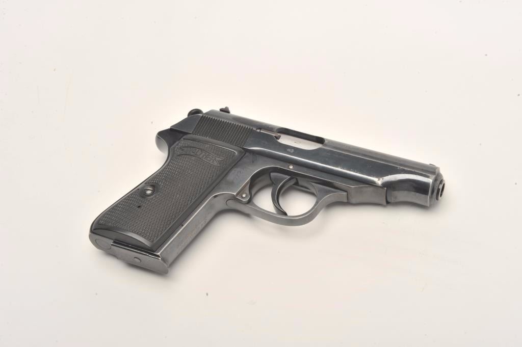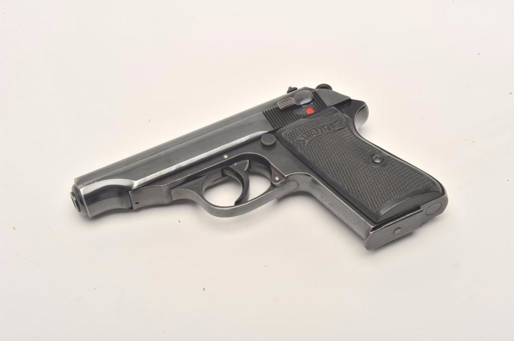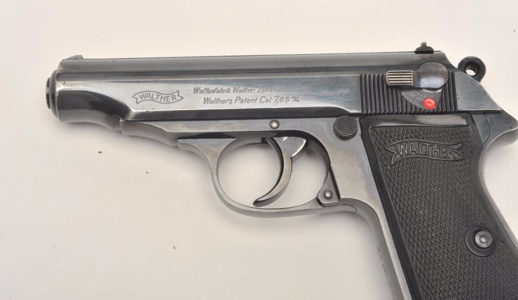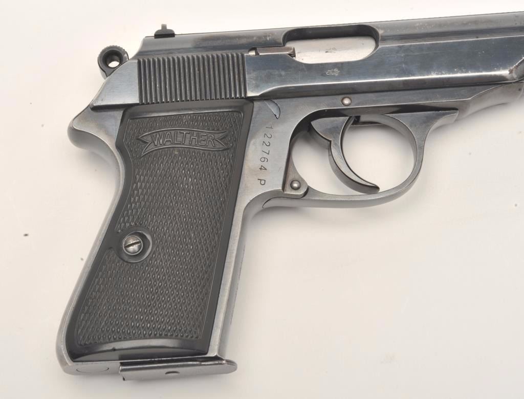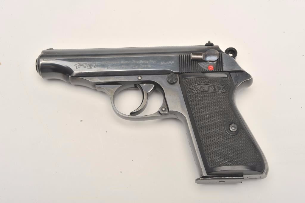 Walther Model PP semi-automatic pistol, 7.65mm caliber, 3.75” barrel, blued finish, checkered plastic grips, rare marking on front grip strap “SA der NSDAP/Gruppe Sachsen”, S/N 122764P, in overall very goodto fine condition displaying the majority of its original finish, very good + bore, crisp action and markings, fine grips. (Modern/PPT). Est.: $500-$1,000.