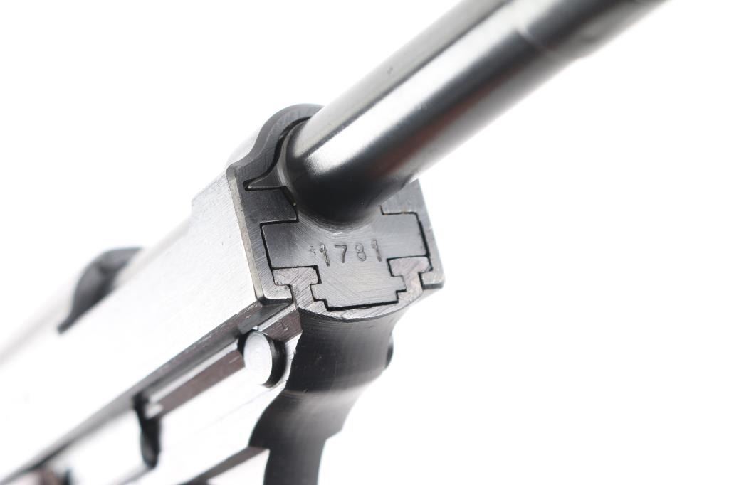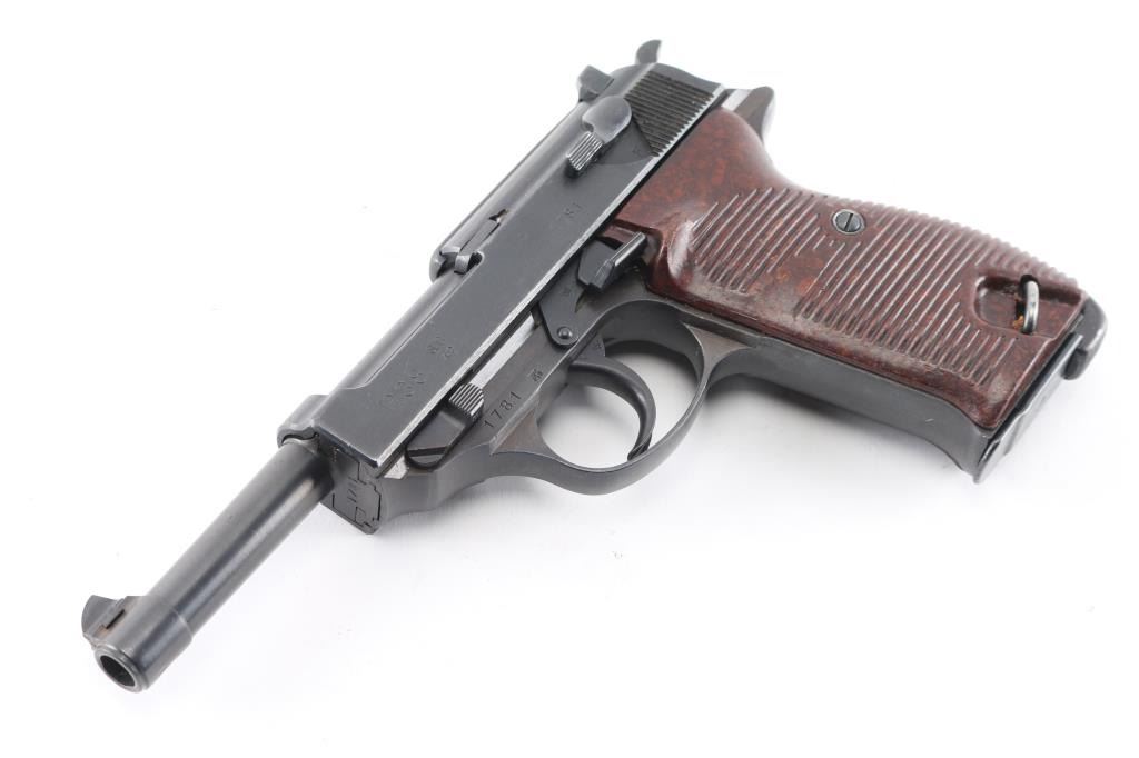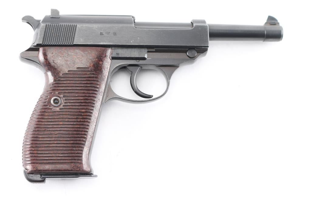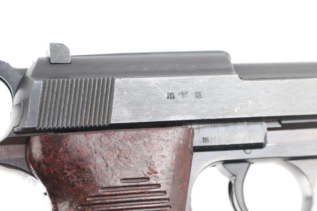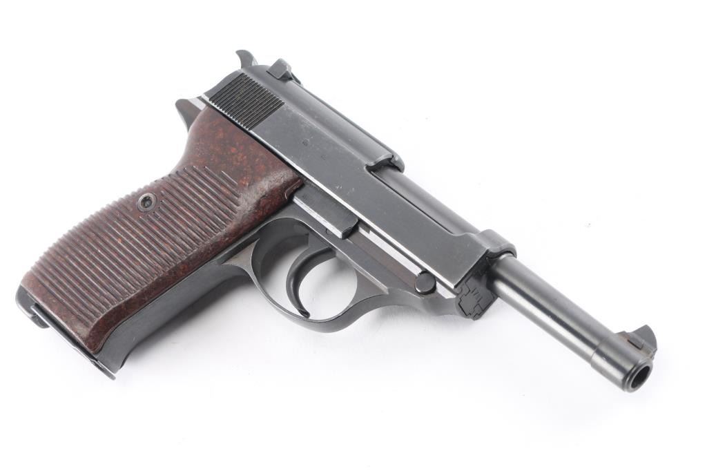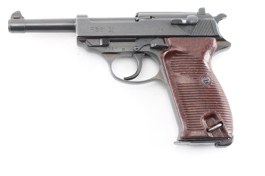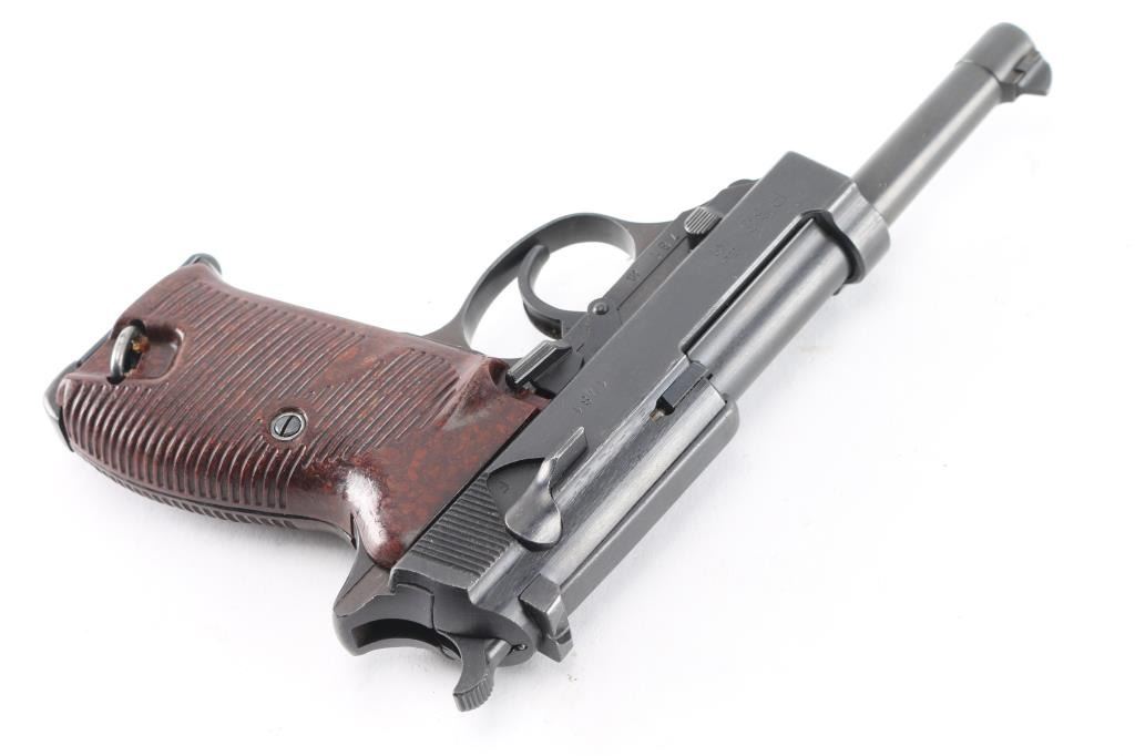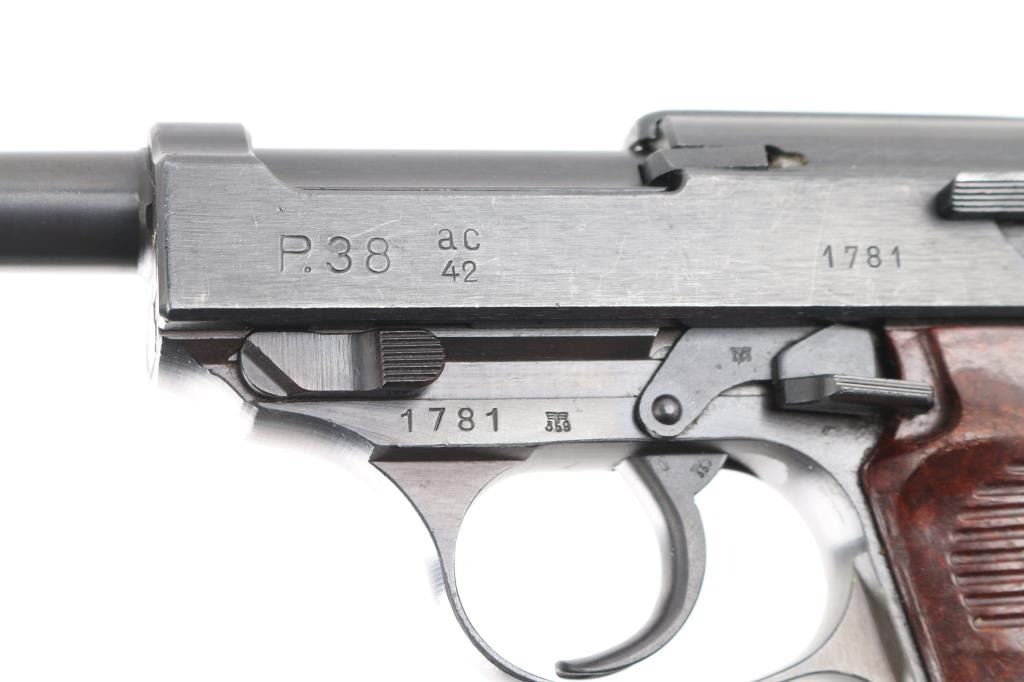 German semi-automatic pistol. 8 rd Magazine. Third Reich era military issued sidearm. 4.9" barrel. Short recoil, hinged locking piece assisted breechblock. ac 42. All matching serial numbers including the locking block. Waffenamts, Eagle/359. All stampings are crisp/clear. Bore appears excellent/bright. Bakelite grips excellent. Original blued finish is about 98% with some very minor scratches, edge wear. Original magazine with waffenamt, "jvd" ( Erste Nordbohmische MetallFabrik ) and "P.38 U". Nice conditioned early Walther. Imported by NHM Co. marked on rear of the frame.NRA Condition-Excellent. C&R Firearm.