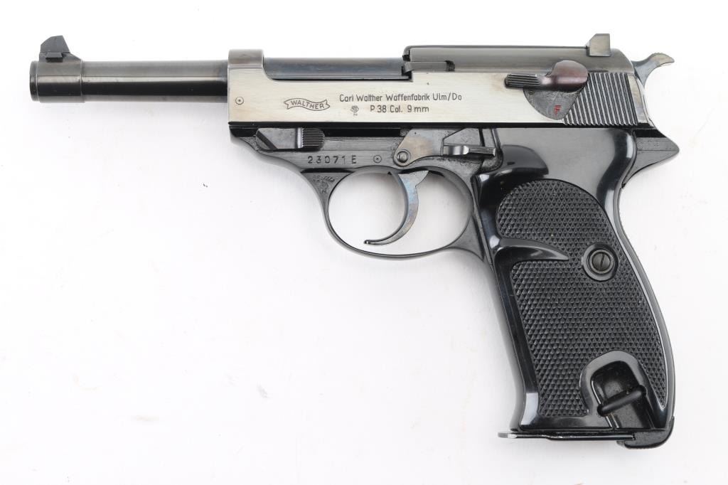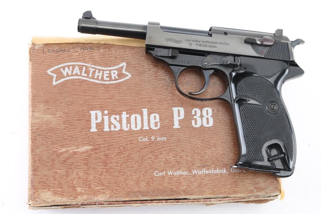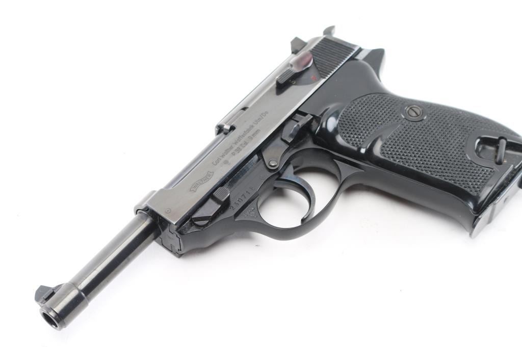 Commercial, post war German semiautomatic pistol, manufactured circa 1966. Features approx 4.75" barrel, dovetailed blade front & notch rear sights, single/double action, decocker safety, heel magazine release, aluminum alloy frame. Bore is excellent/bright. Finish and grips are excellent, action is smooth/tight. Includes a factory box with cleaning rod. Magazine has Walther Banner. Box is poor with separations. Condition is NRA Perfect in Box. C&R Firearm.