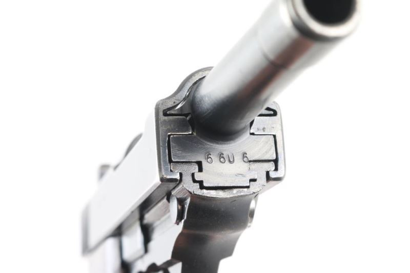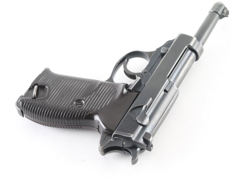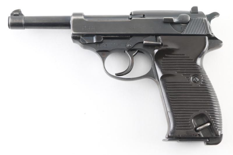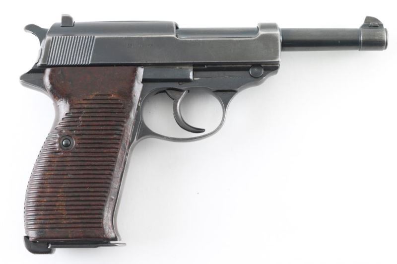 Pistol. Semi-Automatic. 8-rd magazine. Third Reich era Military issued sidearm. 4.9" barrel. Short recoil hinged locking piece assisted breechblock. Late war ac 45. Matched serial numbers including the locking block. Waffenamts. This pistol has seen post-war use with the Vopo (East German Police) . The Vopo crest is stamped on the left triggerguard and frame, and on the right slide. Bore is rough with light pitting, but has strong rifling. Bakelite grips are very good. Blued finish is about 70% with minor scratches edge/muzzle wear, and handling loss. Original magazine stamped P.38. NRA Condition-Good. C&R Firearm.