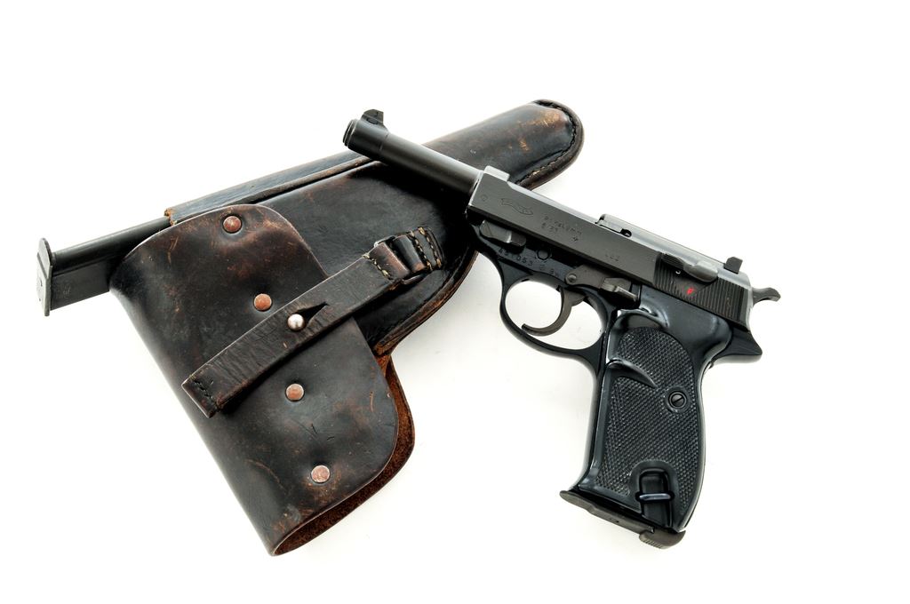 Walther P1 Semi-Automatic Pistol, with holster and extra magazine, #451053, 9mm, 5'' barrel, phosphate finish, black checkered plastic grips, white dot front sight, standard fixed rear sight, with two (2) Walther magazines. Left side of slide is dated 06/83; right side of frame is marked ''Germany'' and is also import marked; left side of frame with a ''BW'' military stamp. In a post-war holster, dated ''62'', by C. Riese, Berlin. Condition is fine. Metal surfaces retain most of the parkerized finish with general faint surface scuffs. Grips with sharp checkering and some micro-scratching and small dents to the flat borders. Excellent smooth action with a bright bore. Holster shows normal moderate age and wear with tight stitching and seams. Est.: $350-$500. (Modern/PPT)