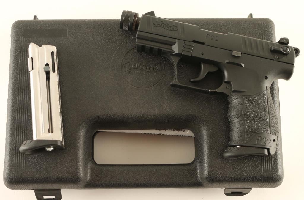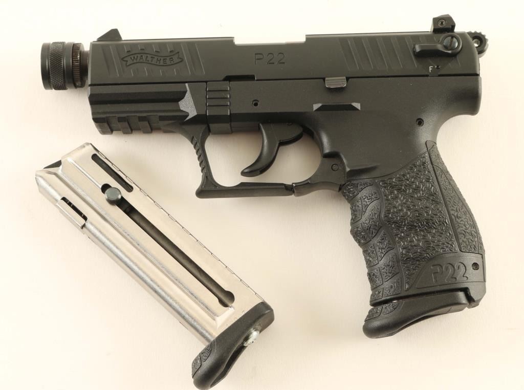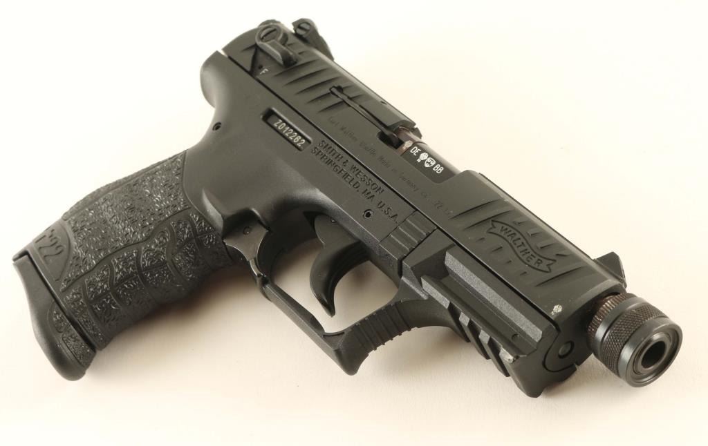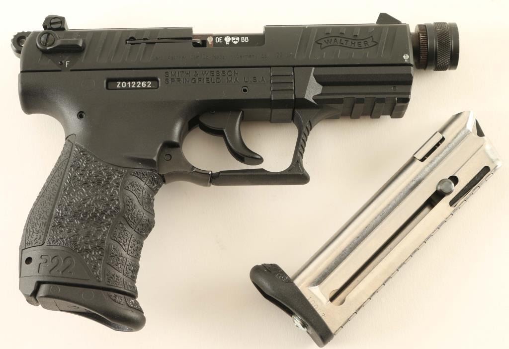 Double action semi-automatic compact pistol chambered in .22 Long Rifle, manufactured in Germany circa 2011. Imported by Smith & Wesson of Springfield, M.A. with import marks on the right side of the frame. Features a matte black finished slide with fore & aft cocking serrations, 3.5" barrel with threaded extension, knurled thread protector, full-length steel guide rod, white-dot front sight, windage adjustable two-dot rear sight, serrated polymer trigger, serrated round hammer spur, ambidextrous safety on the slide, ambidextrous paddle style magazine release, factory 10 round magazine with finger rest floorplate, and black polymer frame with integral accessory rail, textured grip & interchangeable backstrap. Includes the original factory hard case with documents, tools, additional front sights, additional backstrap and a spare magazine with a screw retained floorplate. Pistol retains approximately 98% of its black finish showing some bright wear on the barrel extension with little wear observed elsewhere. Action is smooth, the bore is pristine and the polymer are fine. Condition is NRA Excellent in case. ***Modern Firearm***