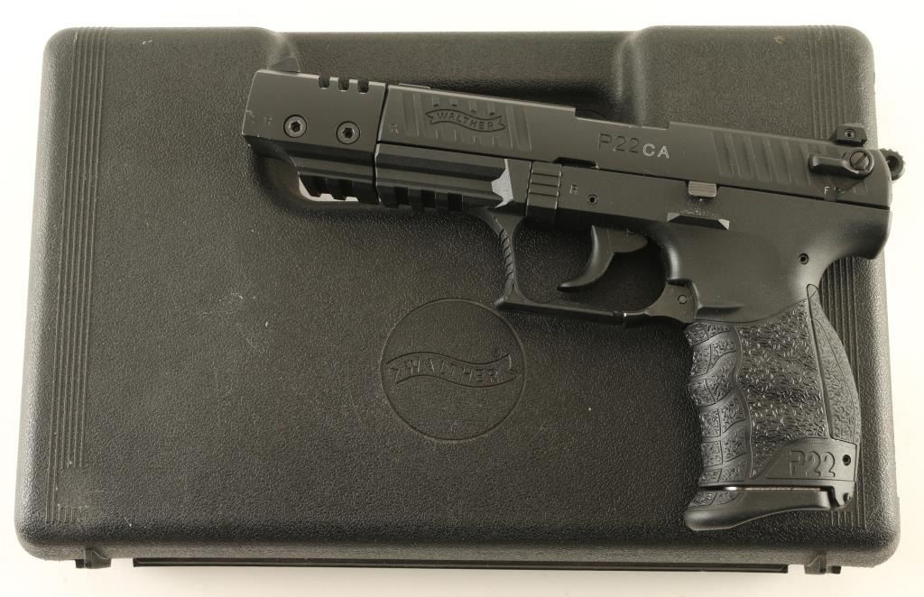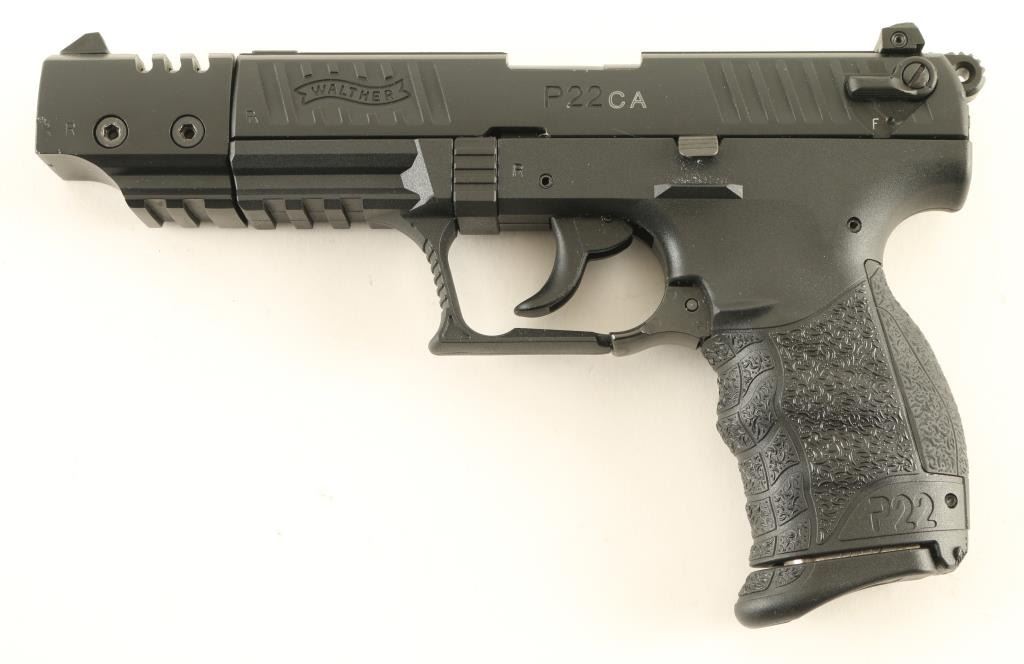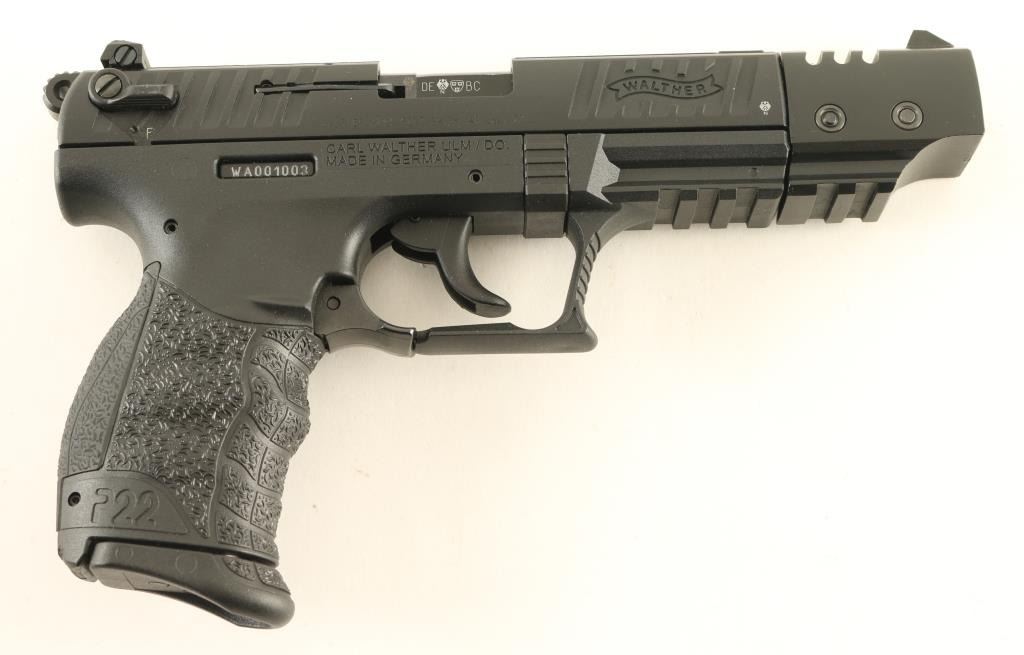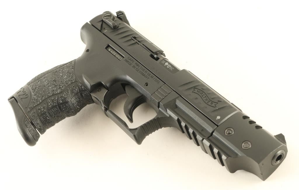 German semiautomatic rimfire pistol imported by Walther Arms, Ft Smith AR. Features matte black metal finish, textured black polymer frame with replaceable backstrap inserts, 5" barrel, fixed slide extension at muzzle with faux muzzle brake cuts, adjustable 3 dot sights, ambidextrous magazine release, slide mounted manual safety, accessory rail under barrel. Bore is excellent. Overall excellent external condition, with few signs of handling. Includes (1) magazine, (1) backstrap insert, manual, factory hard plastic case. Condition is NRA Excellent - like new *** Modern Firearm ***