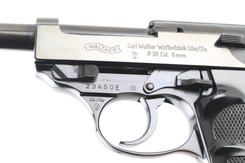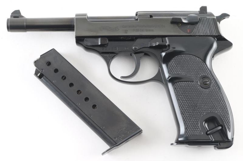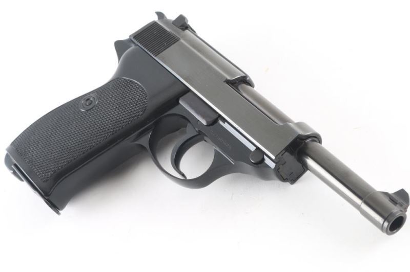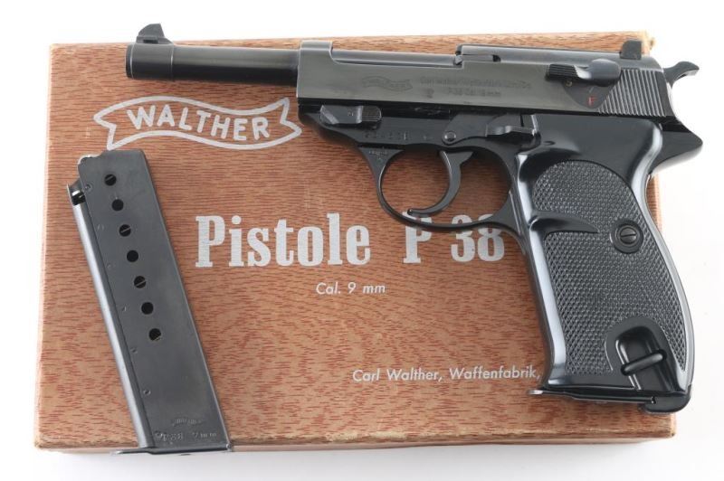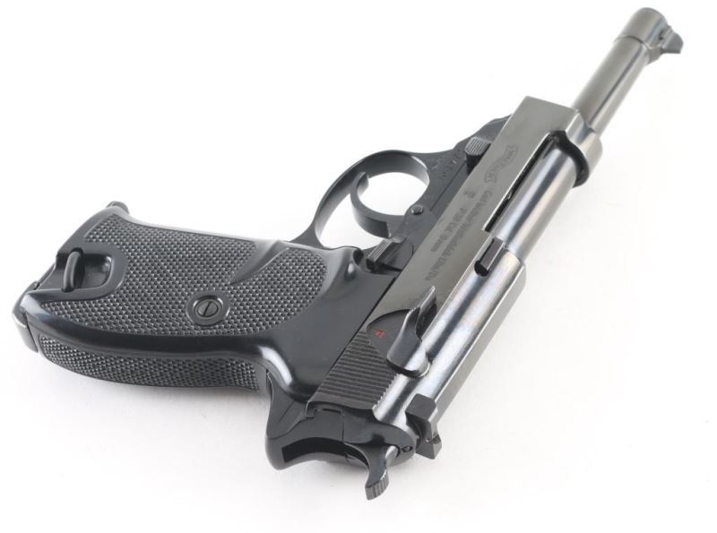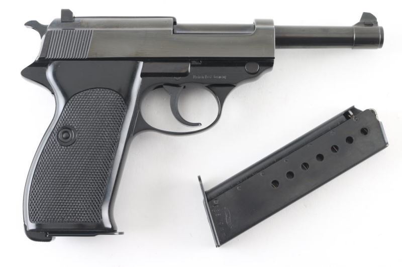 Pistol. Semi-Automatic. 8 rd Magazine. Post-War Commercial. 4.9" barrel. Short recoil, hinged locking piece assisted breechblock. Alloy frame. High polish blued finish. Black plastic checkered grips. Walther banner. Triggerguard stamped "66" for 1966. Single line slide markings were manufactured. Commercial "Eagle/N" proofs present. "4" stamped on front sight blade. Right frame stamped "Made in West Germany". Bore, finish, and grips are excellent. Comes with two Walther banner magazines with grooved followers. Original factory box numbered to the pistol. Manual, test firing target, and cleaning rod included. NRA Condition-Near Perfect. C&R firearm