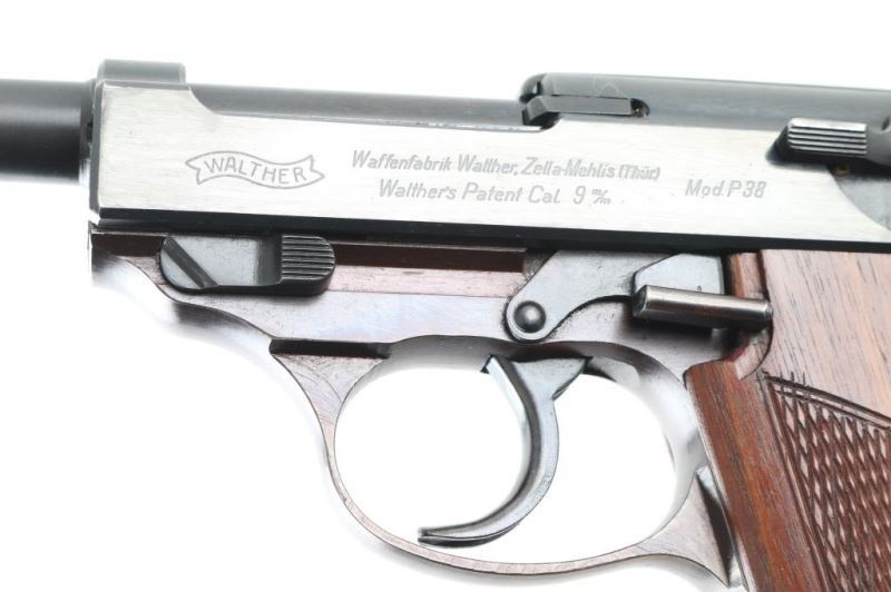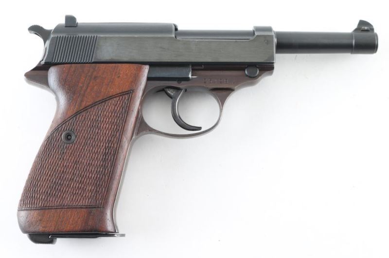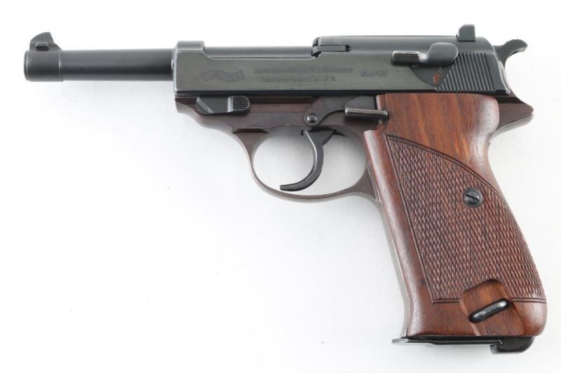 Pistol. Semi-Automatic. 8 rd Magazine. Third Reich era commercial pistol. Late war production. 4.9" barrel. Short recoil, hinged locking piece assisted breechblock. Early slide is marked with the Walther banner followed by the two-line factory legend and "Mod.P38. . Matching serial numbers on the right side of frame, barrel lug, and locking block. The slide is serial# 25427. Eagle/N commercial proofs are on the right frame and slide. "4" stamped on front sight blade. Bore appears excellent/bright Checkered wood grips are very good. Possibly later replacements. Blued finish is about 99%. Frame has the late war plum/red tinted finish. Original magazine stamped "P.38v" over "U". NRA Condition-Near Excellent. C&R firearm