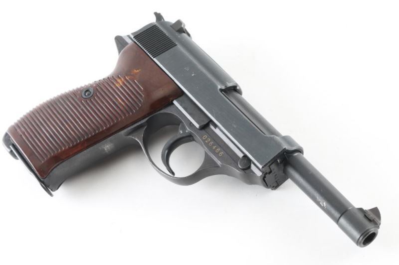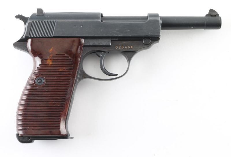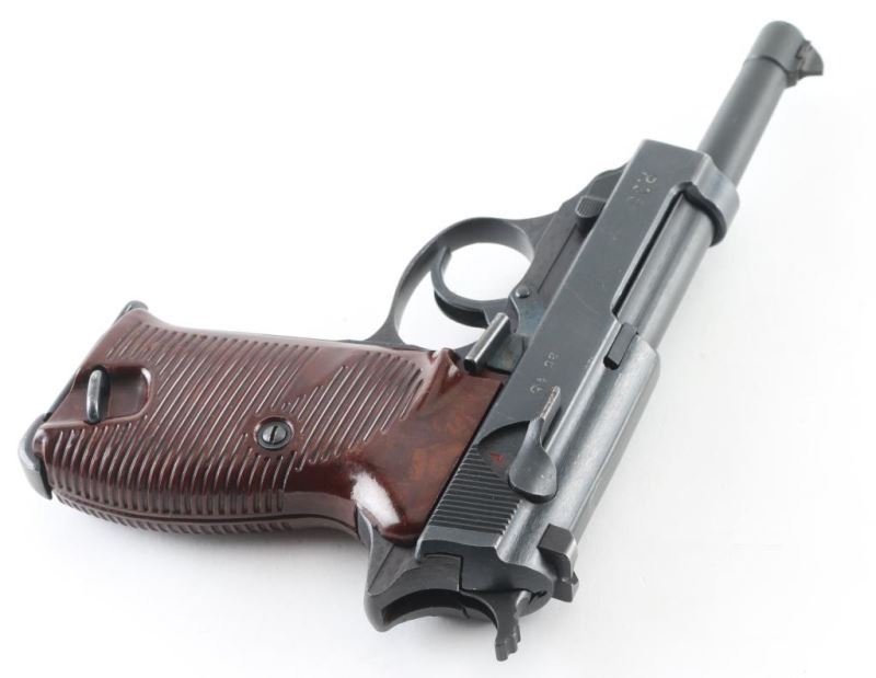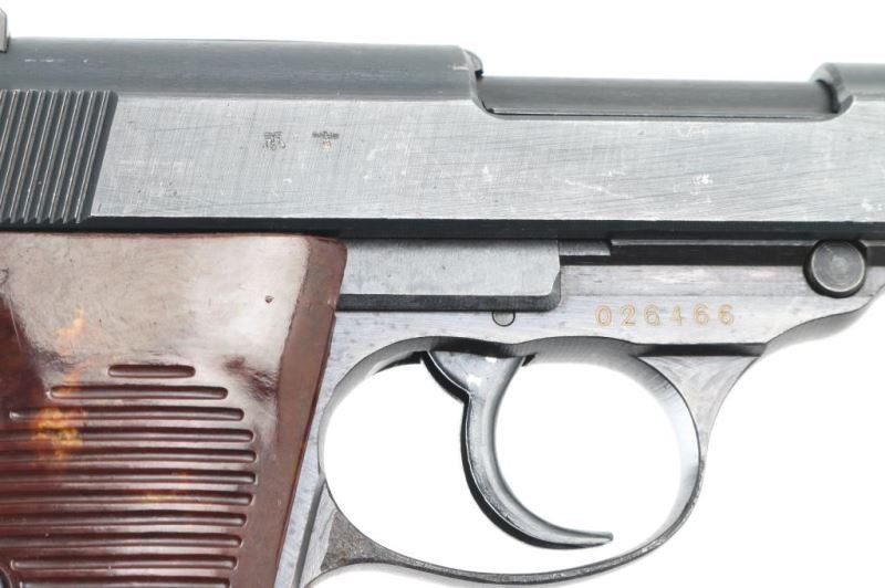 Pistol. Semi-Automatic. 8-rd magazine. Mismatched. Third Reich era Military issued sidearm. 4.9" barrel. Short recoil hinged locking piece assisted breechblock. Late war ac 45. Rare "O" series. Front sight blade marked "2". matched serial numbers on right frame, barrel lug,top of slide rail. and locking block. Eagle/539 and proof marks on the right slide. Bore is very good/bright , strong rifling. Bakelite grips are good. Blued finish is about 95% with minor scratches edge wear. Original magazine marked P.38v over U. NRA Condition-Very Good. C&R Firearm.