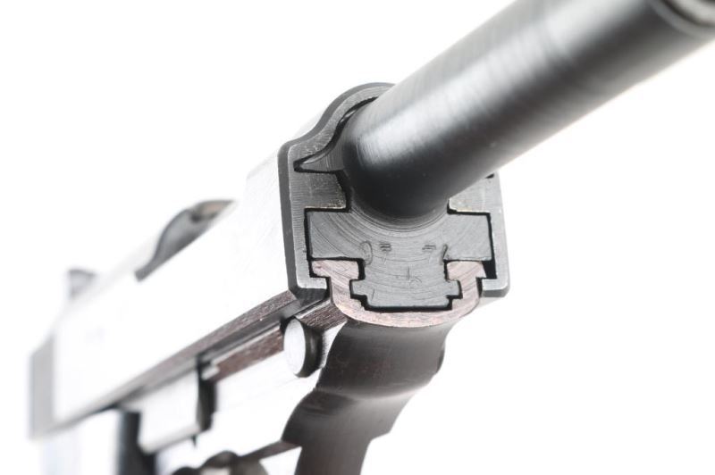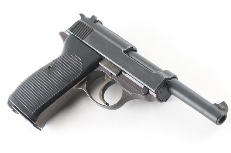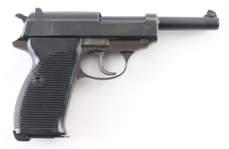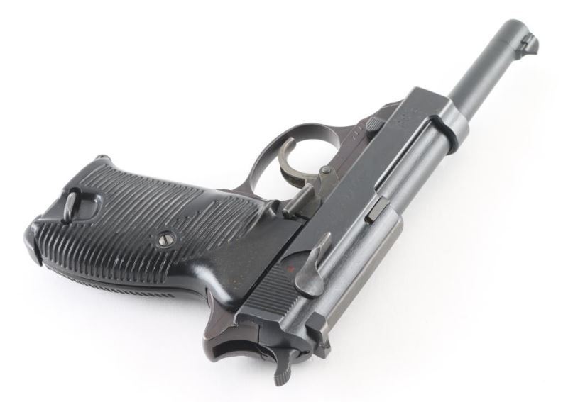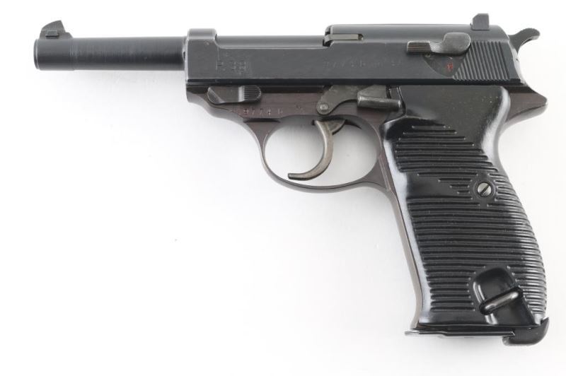 Pistol. Semi-Automatic. 8 rd Magazine. Third Reich era military issued sidearm. 4.9" barrel. Short recoil, hinged locking piece assisted breechblock. "9774 b ac 45" in straight line on left slide, this is a 1945 dated pistol in the B block. ac 45. Matching serial numbers including the locking block. Waffenamt Eagle/359, and proof on the right slide. "3" stamped on the front sight blade. Has reddish/plum colored frame. Bore appears ver good/bright. Bakelite grips excellent. Blued finish is about 96% with scratches Original magazine with waffenamt and "P.38" "jvd", and waffenamt. NRA Condition-Very Good. C&R firearm
