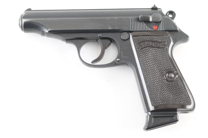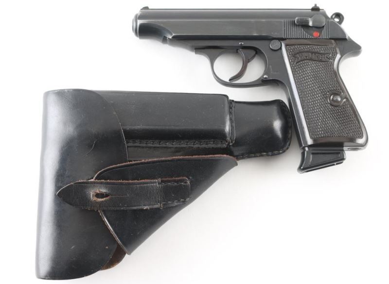Pistol. Semi-Automatic. 8 Rd Magazine. Straight blow-back action. Third Reich era Military issued Pistol. Crown/N proofs on right frame and barrel. Left slide stamped with Walther address, "Zella Mehlis" Patent, caliber in two lines, followed by "Mod. PP. WaW359 waffenamts stamped on left frame and slide. Serial number matched on slide and frame. 3.9" barrel. Ring hammer. 90 degree safety/decocker. Bore appears good/bright. Strong rifling. Blued finish is a bout 95% with some edge wear/scratches. All markings are crisp/clear. Brown plastic checkered "Walther" grips are very good. Magazine stamped with "Walther" banner and "PP 7.65mm". Comes with correct, "HSU44" marked holster with waffenamt, black leather holster. NRA Condition-Very Good. C&R Firearm.