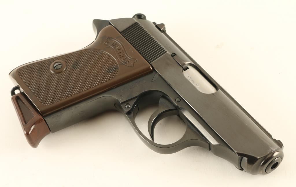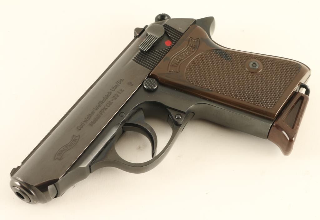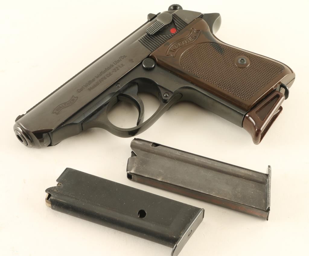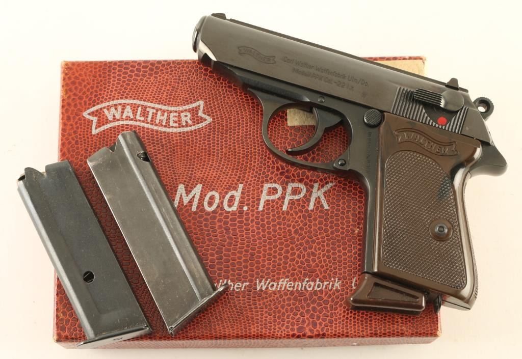 German semiautomatic rimfire pistol features blued finish, brown plastic checkered grips with "WALTHER" banner, 3.25" barrel, fixed sights (rear sight in dovetail), slide mounted manual safety/decocker, lanyard ring at butt. Bore is excellent condition. Retains 95% deep blue with few signs of bare metal at muzzle, sharp edges. Magazine is excellent with brown plastic finger extension. Grips are very good condition, have a black streak on left side that appears to be part of the plastic. Markings include "Made in West Germany", eagle over "N" proofs, Ulm proof house mark and "68" on barrel chamber. No import marks observed. Includes two spare flat bottom magazines (three total), good condition factory cardboard box, manual, factory test target, cleaning rod with brush. Condition is NRA Very Good ++ *** C&R Firearm ***