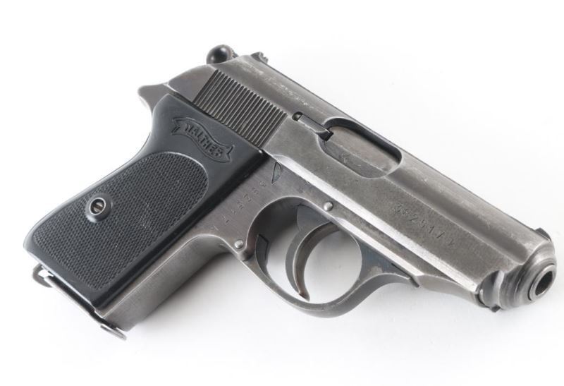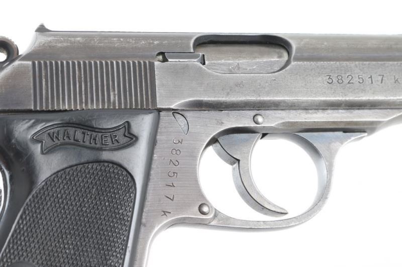 Pistol. Semi-Automatic. 7 Rd Magazine. Straight blow-back action. Third Reich era Military issued Pistol. Crown/N proofs on right frame and barrel. Left slide stamped with Walther address, "Zella Mehlis" Patent, caliber in two lines, followed by "Mod. PPK. WaW359 waffenamts stamped on left frame and slide. Serial number matched on slide and frame. 3.3" barrel. Ring hammer. 60 degree safety/decocker. Bore appears good/bright. Strong rifling. Blued finish is a bout 20% with blue on the triggerguard/trigger, traces in recessed areas, and on the rear of the slide. All markings are readable. Black plastic checkered "Walther" grips are very good. Magazine stamped with "Walther" banner and "PPK 7.65mm". NRA Condition-Fair/ Good. C&R Firearm.