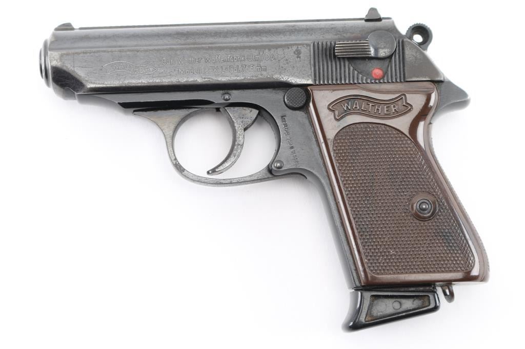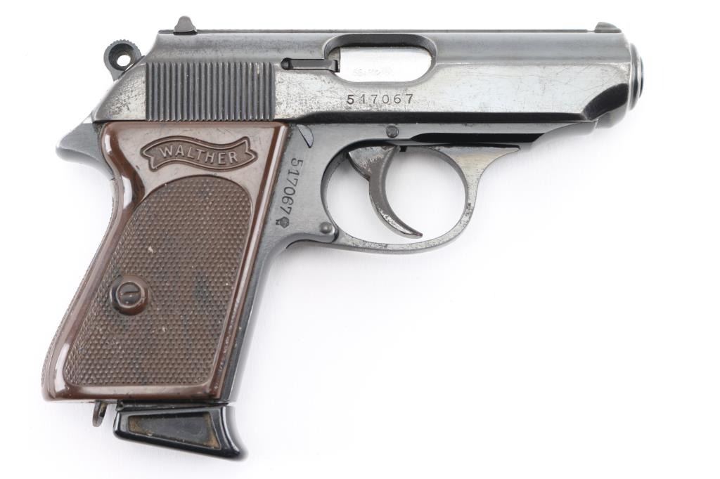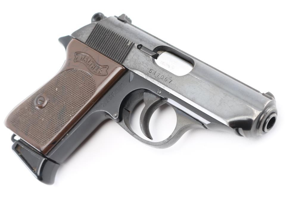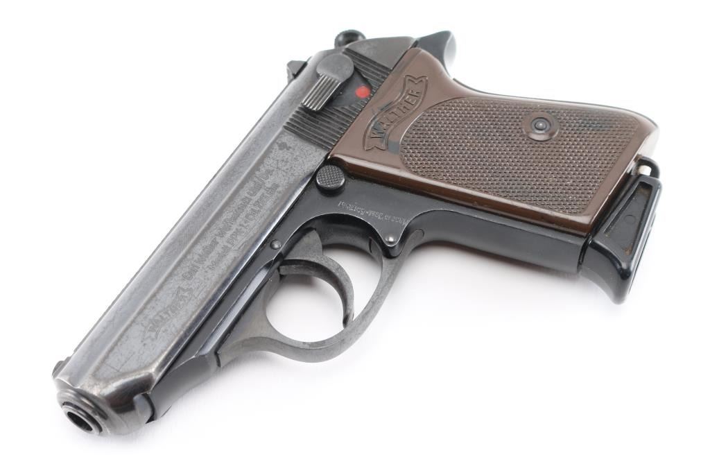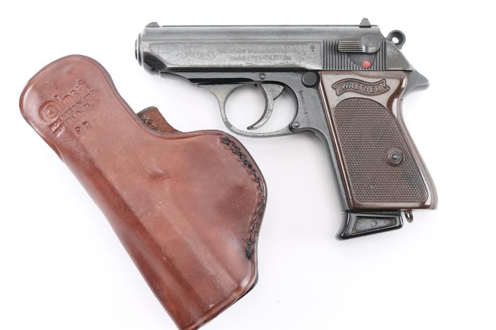 Also known as the "PPK-Dural", this rare post-war pistol was made in West Germany in 1966 using a steel slide and a Duralumin alloy frame. It has post-war "Eagle/N" commercial proof marks present on the barrel, slide, and frame, and matching serial numbers on the frame & slide. With fixed sights, ring hammer, 60 degree safety/decocking lever, and lanyard staple in the butt. "Ulm/Do." address, "Made in West Germany" on left frame behind the trigger. black light weight aluminum frame. Bore is excellent/Bright. action is smooth, checkered brown plastic "Walther Banner" grips are excellent, metal finish is about 70% with edge/holster wear, minor scratches, Come with original Walther marked magazine with finger extension, a brown leather clip holster. NRA Condition-Good. C&R Firearm