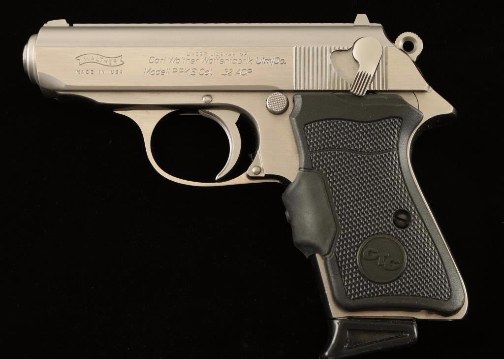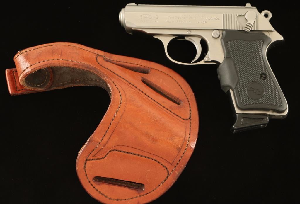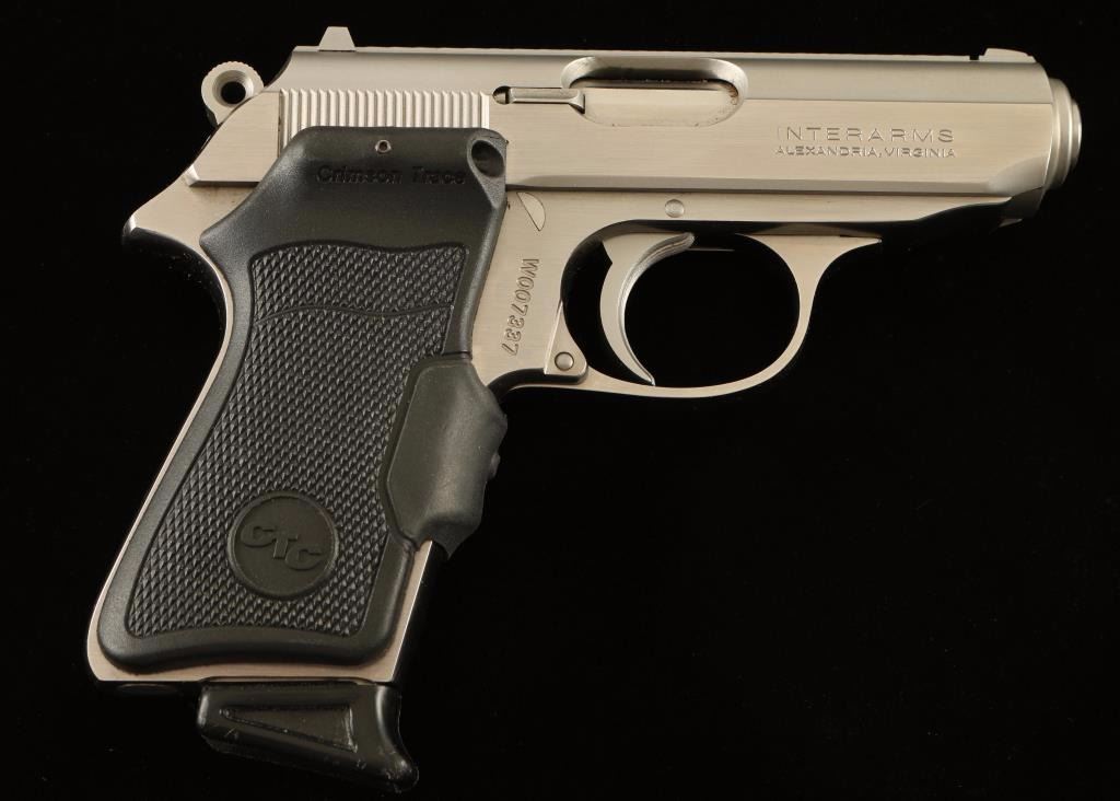'Interarms' American made stainless steel double action semi-automatic compact pistol chambered in .32 Automatic. Features a brushed/satin finish, 3.35" barrel, fixed patridge front sight, dovetailed rear window sight, thumb safety/decocker, serrated trigger, serrated round hammer spur, push button magazine release, factory 8 round magazine, and Crimson Trace checkered black plastic laser grips. Includes a Strong smooth brown leather holster. Pistol exhibits very little wear with only minor superficial scratches and a couple small nicks on the slide observed. Action is strong, bore is pristine and laser grips are fine. Condition is excellent. ***Modern Firearm***