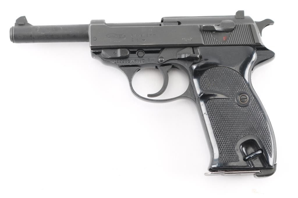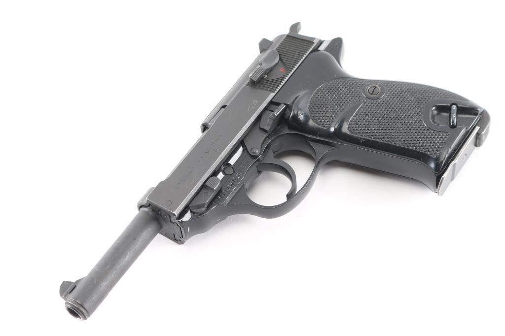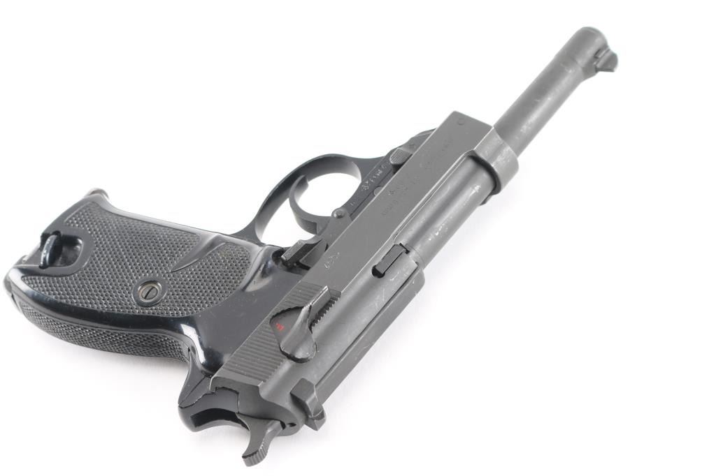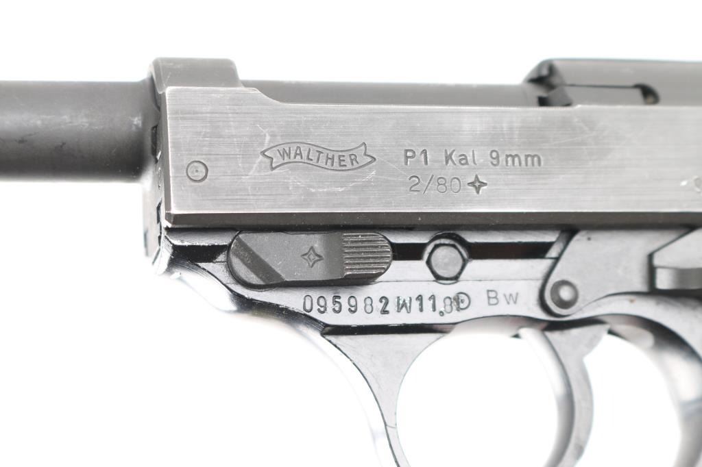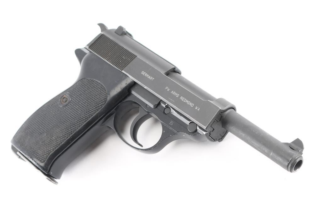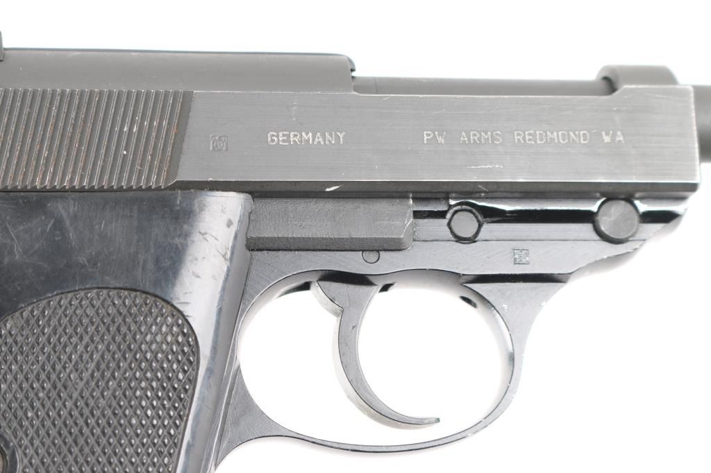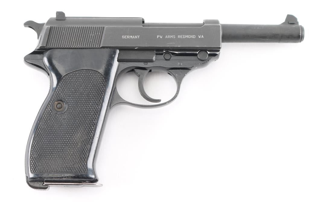German double action semi-automatic pistol chambered in 9x19mm, imported by PW Arms, Redmond WA. Slightly updated P.38 made after WWII with an aluminum frame. Dated 1980. Features a dark gray parkerized finish on steel parts and black anodized finish on the aluminum alloy frame, 4.9" barrel, dovetailed blade front sight, square notched rear sight, smooth trigger, serrated hammer spur, thumb safety/decocker, lanyard loop on frame, heel magazine release, two-piece checkered black plastic grips. Bore is very good. Retains 90% finish with handling wear, scuffs and edge losses. "BW" marking (for German Bundeswehr). "982" stamped on slide and on barrel. Includes one "Walther P38" marked magazine.Condition is NRA Very Good*** Modern Firearm ***