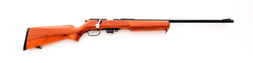 Wards Westernfield Model 45 Bolt Action Rifle, NVSN, .22 S-L-LR cal., 24'' barrel, black finish, pistol grip hardwood stock, black rubber Weatherby recoil pad, sling swivels, chrome-plated bolt and trigger, blade front sight, with standard notched elevator rear sight and one magazine. Left rear section of the receiver with two drilled and tapped holes for a receiver sight. In good condition as refinished. Metal with approx. 98% non-factory black finish that was applied over some light pitting, most noticeable on the receiver. Wood is near excellent with only a few small handling marks and a nice oil type finish. Very good action and bright bore. Est.: $75-$125. (C&R)